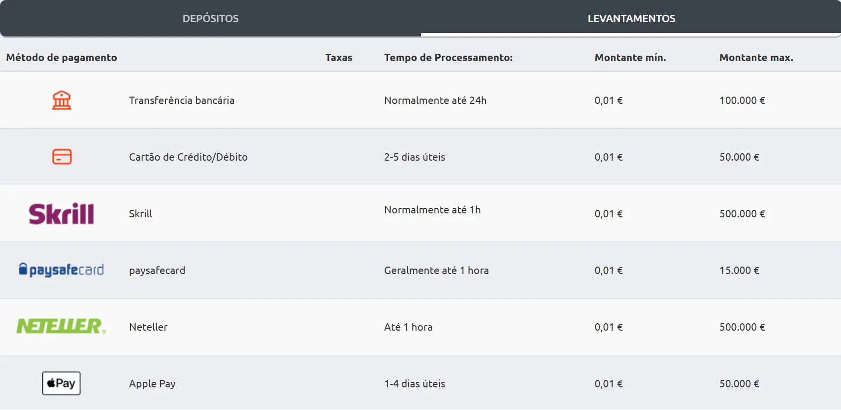 Por outro lado, caso pretenda levantar com cartão de crédito ou carteiras digitais, deve efetuar pelo menos um depósito através destes métodos de pagamento, procedendo de igual modo à sua respetiva verificação.