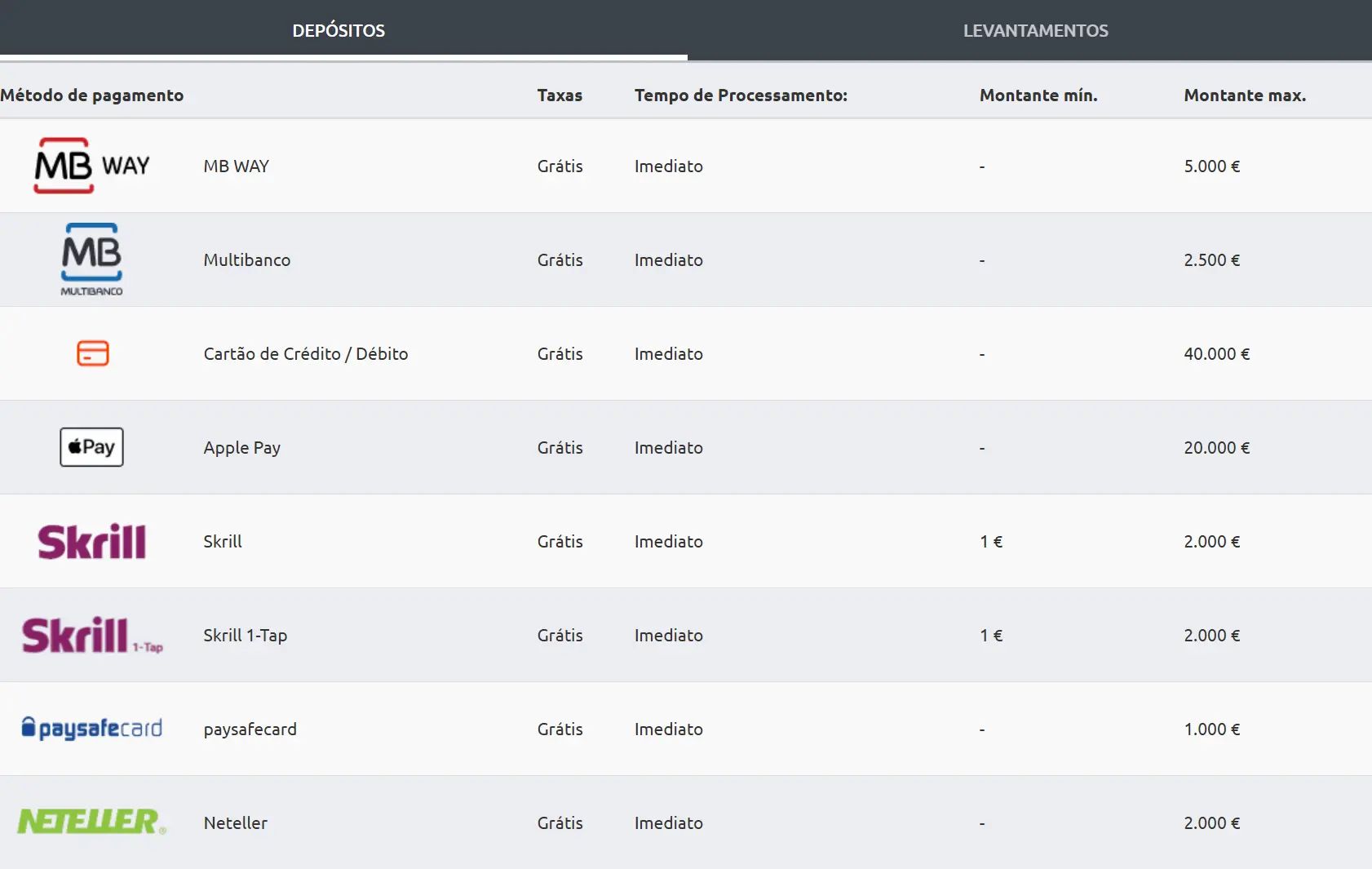 Na app da Betano vai encontrar os mesmos métodos de pagamento presentes nas versões desktop e mobile. De momento, são estes:
