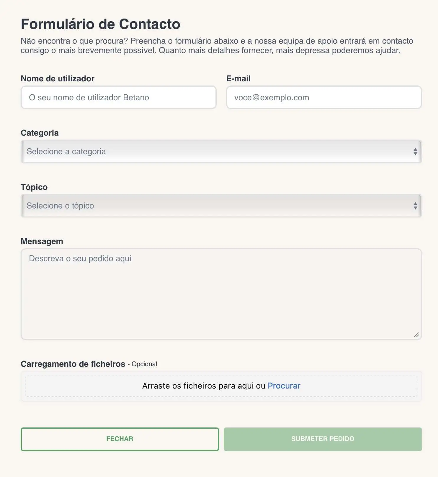 Para questões mais detalhadas ou que não exijam resposta imediata, os utilizadores podem recorrer ao formulário de contacto ou ao e-mail oficial da Betano: apoio@betano.pt. Estas opções permitem descrever a situação com clareza e anexar documentos.