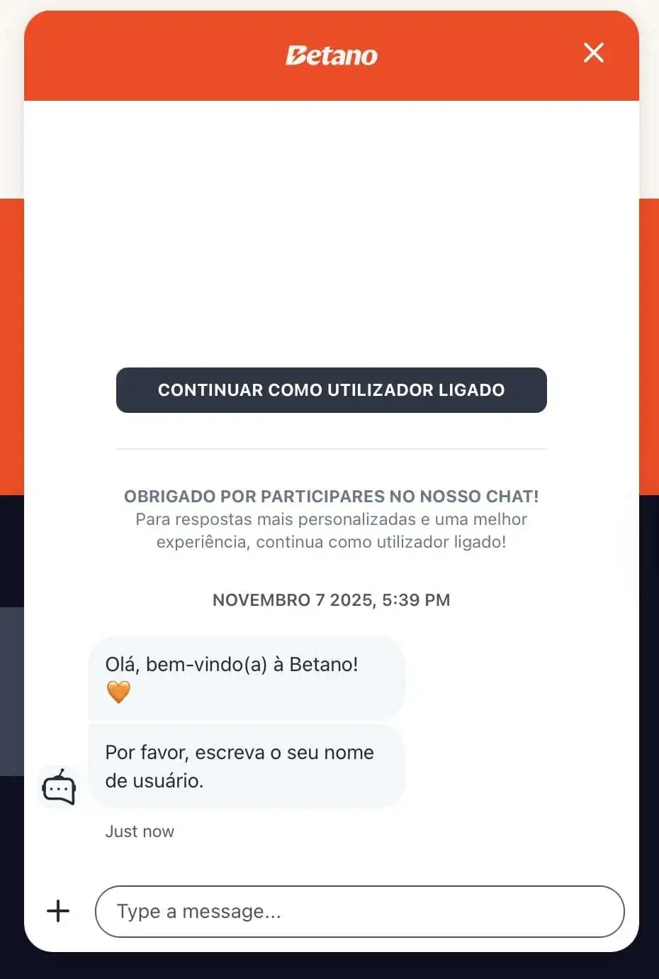 De imediato, será aberto um chat no canto inferior direito do ecrã. O utilizador deve preencher os seus dados (nome e e-mail) e selecionar o tópico da questão, como depósitos e levantamentos, ofertas como o código promocional Betano, a conta e login, entre outros.