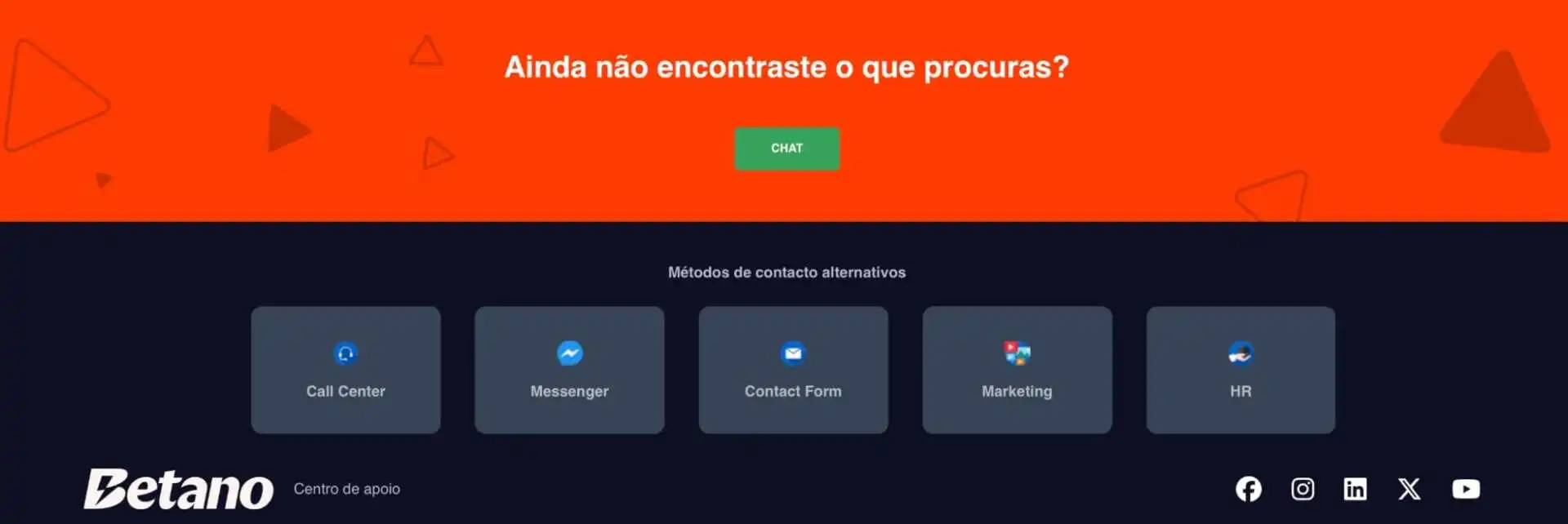 São disponibilizadas cinco formas principais de contactos da Betano. Entre estas opções, destaca-se a oportunidade de adaptar o tipo de atendimento à natureza do seu problema ou dúvida.
