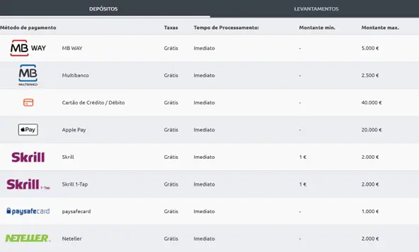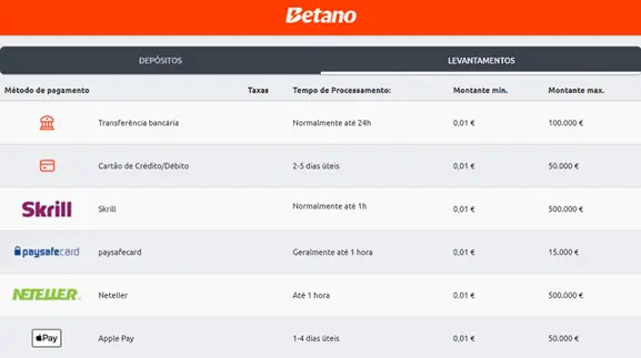 Em todo o caso, convém referir que nem todos os métodos partilham o mesmo limite máximo de levantamento. No seu website, a Betano Portugal oferece 6 (seis) métodos distintos. Por outro lado, o limite mínimo de levantamento é transversal a todos os métodos disponíveis: