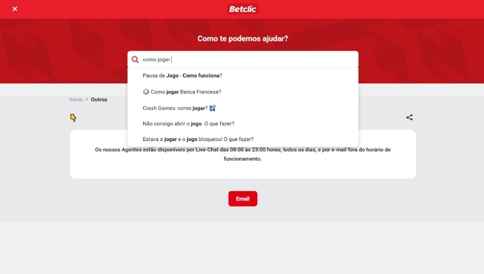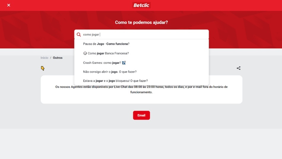 Para contactos com a Betclic Portugal a qualquer hora do dia, pode, em alternativa, enviar uma mensagem de correio eletrónico. Dito isto, o horário de atendimento do apoio ao cliente é igual em todos os contactos Betclic Portugal.