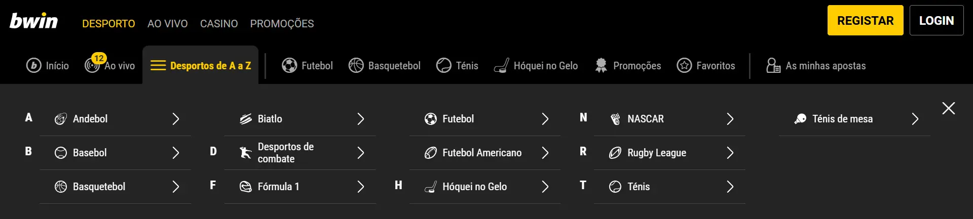 Entre as modalidades desportivas presentes, incluem-se, a título de exemplo, Ténis, Fórmula 1, Desportos de combate ou Andebol. Organizados de A a Z, os diversos desportos abrangidos na secção de apostas da bwin podem ser encontrados mais facilmente. Para isso, basta premir o respectivo ícone.