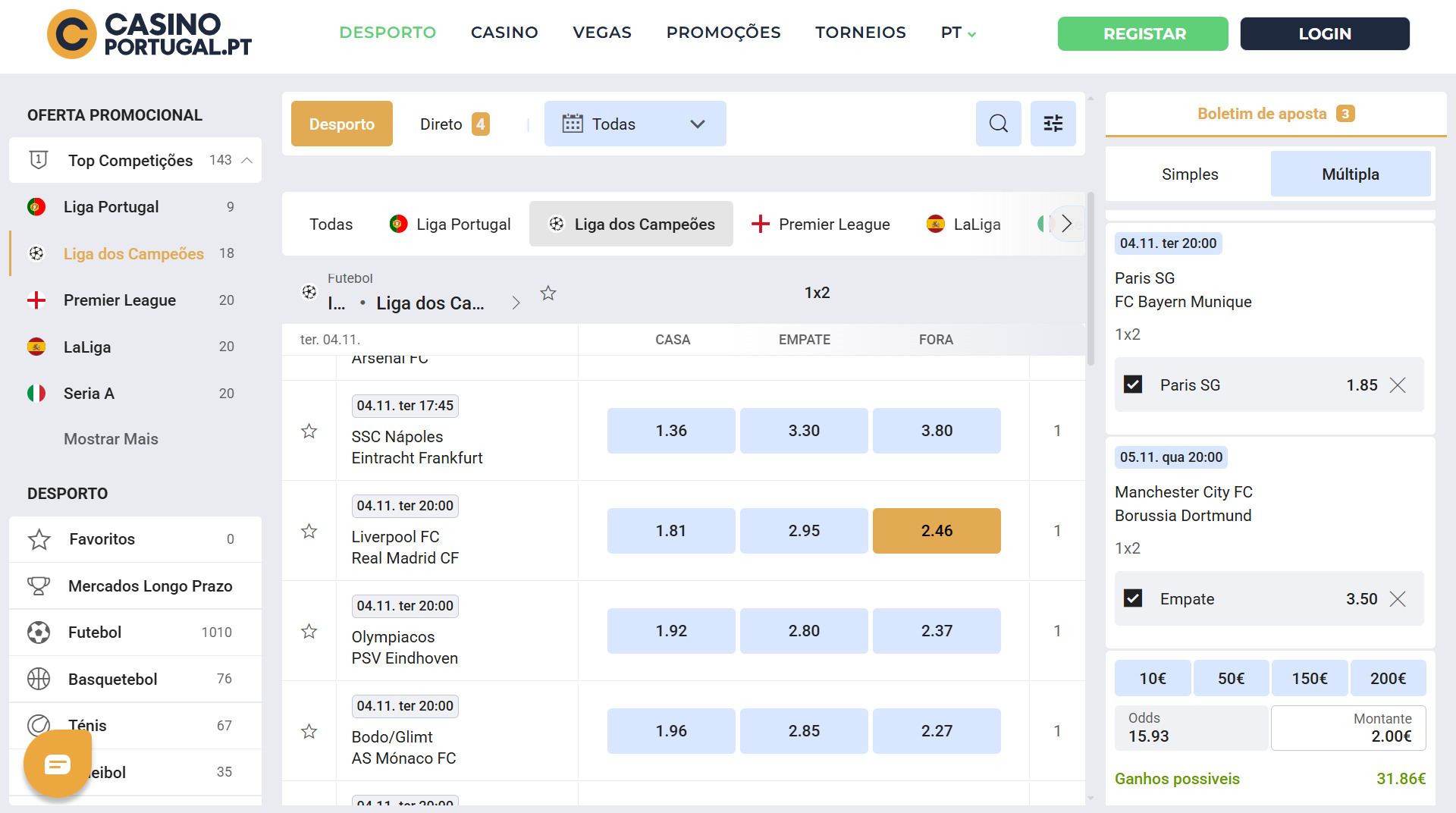 O bónus do Casino Portugal para desporto compõe-se de uma aposta grátis no valor de 2€. A freebet deve ser submetida num boletim de aposta múltipla com pelo menos três seleções pré-jogo ou ao vivo.