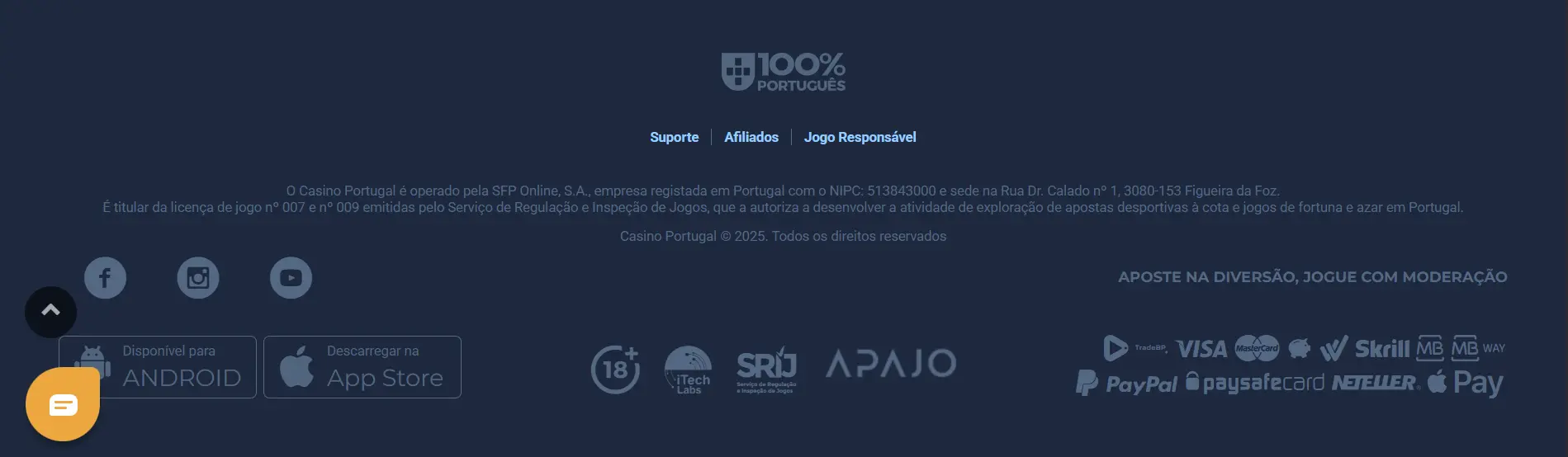 Na versão mobile, os ícones do aplicativo móvel não estão presentes no website oficial do Casino Portugal. Por isso, aceda antes ao Google Play ou à App Store para fazer o download e instalar a app. Verifique previamente os requisitos mínimos do sistema, o tamanho do ficheiro e a política de partilha de dados.