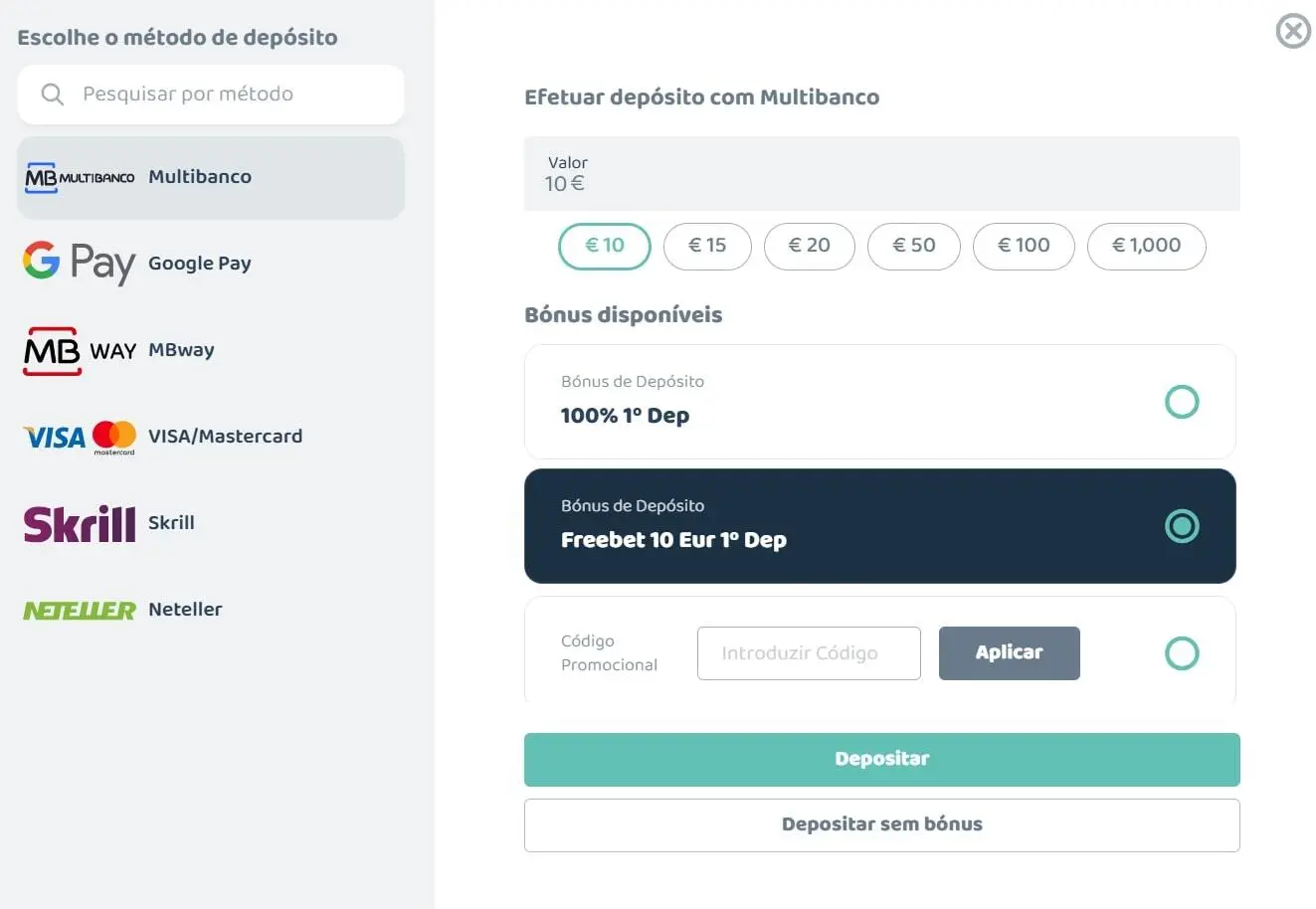 Para reclamar até 20€ em freebets tem de proceder a um depósito inicial mínimo de 10€. Para creditar a sua conta de jogador com dinheiro real, cumpra as seguintes etapas: