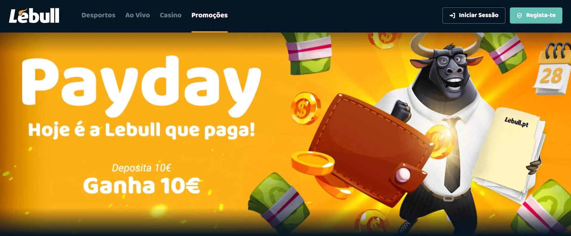 Pode usar este bónus da Lebull para receber 10€ e jogar nas slots do casino. Entre as 00:01 e as 23:59 do dia 28 de cada mês, basta fazer um depósito mínimo de 10€. Ao efetuar o depósito, deve selecionar a oferta Payday.