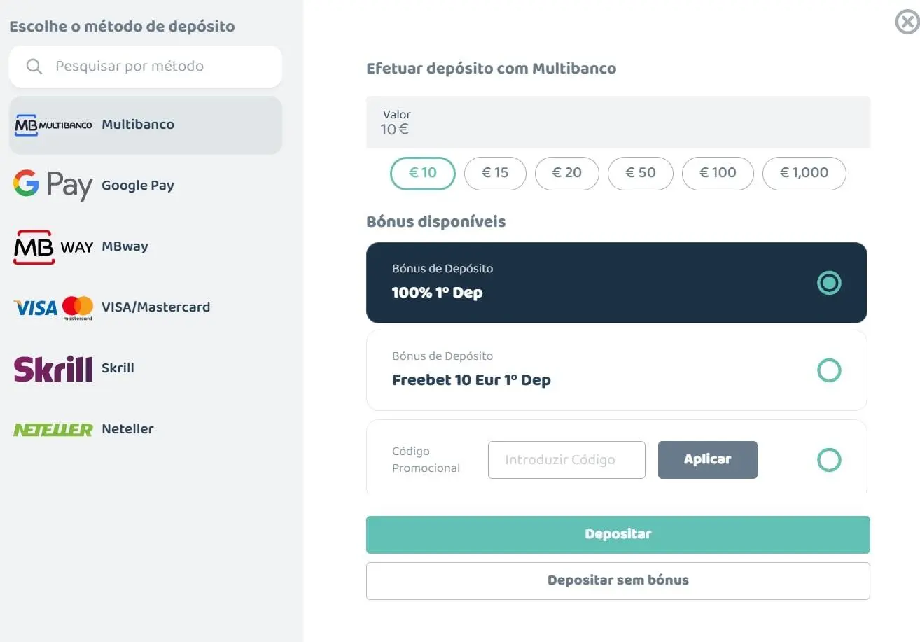 - Selecione o Bónus de Depósito Freebet 10 Eur 1.° Dep.