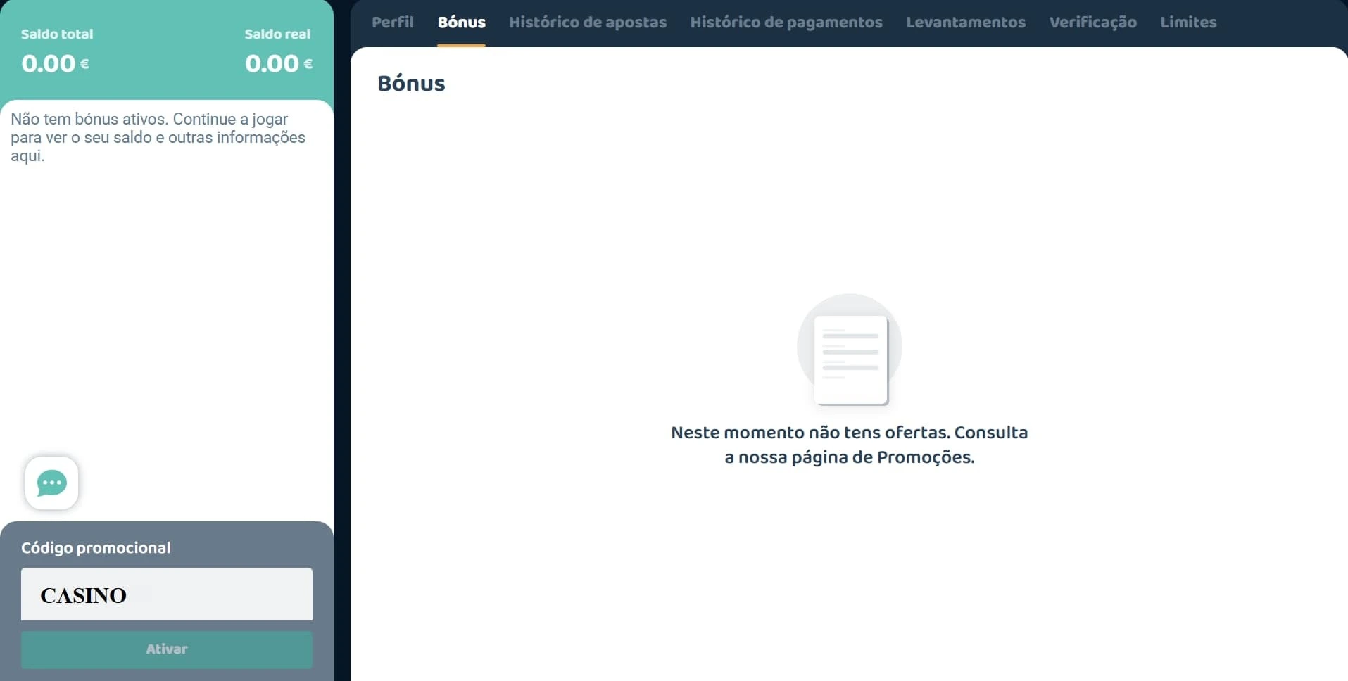 - Código promocional: CASINO (clique neste código para o validar e vá direto para a página)