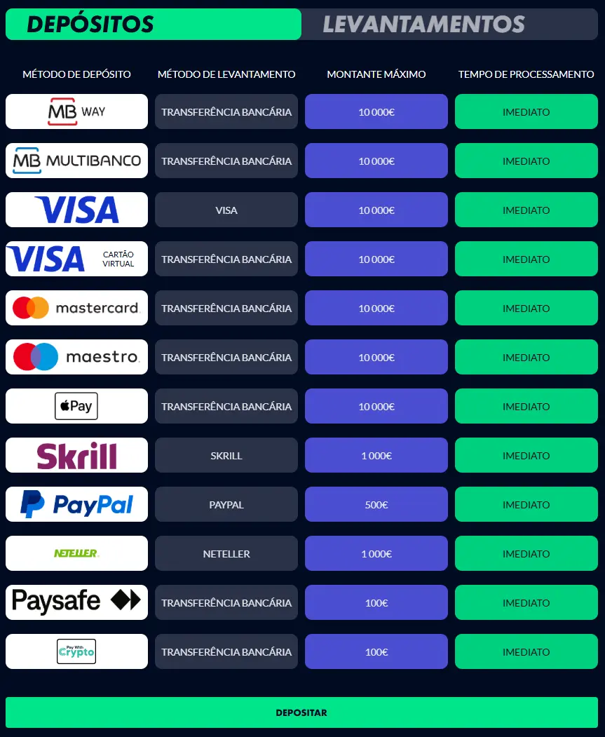 - Paypal, Neteller e Skrill (carteiras digitais): normalmente imediato ou muito rápido; em casos excepcionais pode demorar até 48 horas.