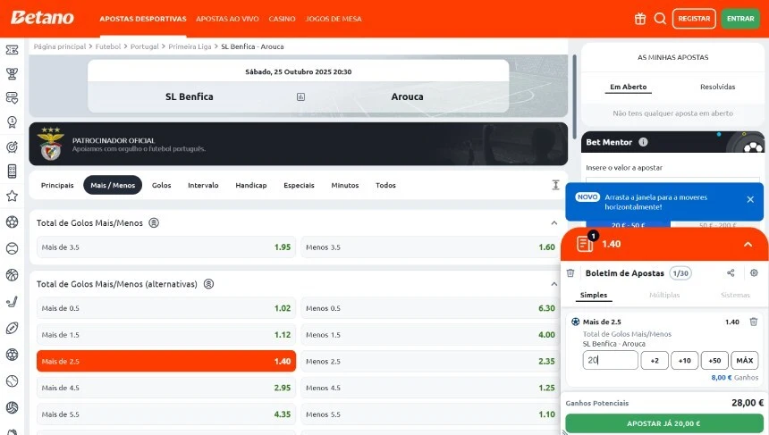 Uma outra alternativa, igualmente popular entre os apostadores da Liga Betclic, é o mercado de golos. Na sua versão tradicional, refere-se ao número mínimo de golos que poderão ser marcados em tempo regulamentar. Neste caso, um dos prognósticos mais vezes em destaque é o célebre "Mais de 2.5 golos".