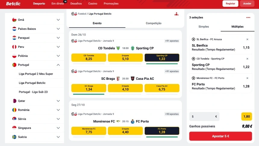 Por exemplo, na operadora Betclic, a Liga Portugal costuma surgir destacada no Top de competições, pois a casa de apostas patrocina a competição. No entanto, pode sempre utilizar o motor de busca ou procurar diretamente por modalidade e país.