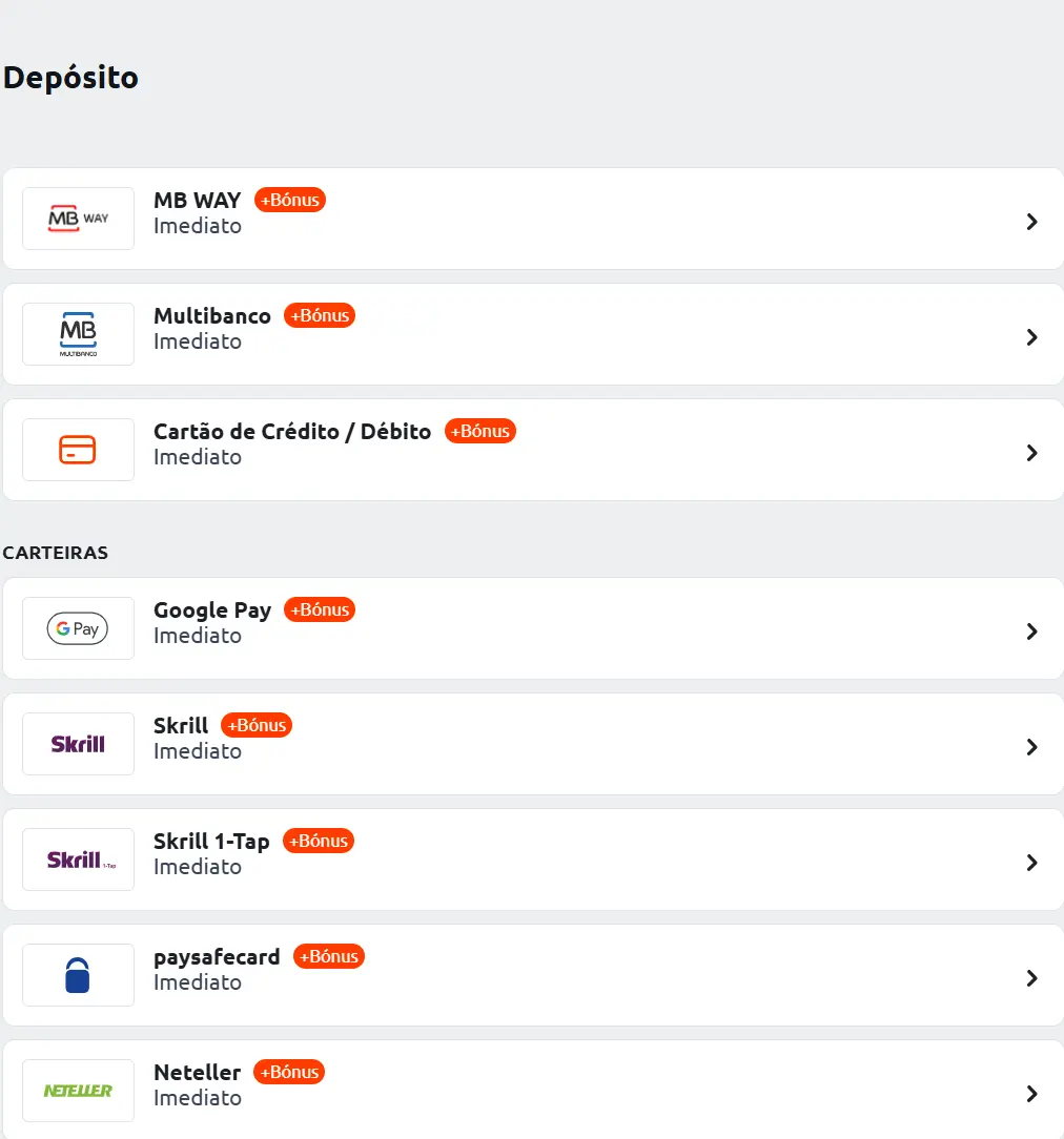 | Skrill 1-Tap | Sim | 1€ | 2 000€ | Imediato | --- | --- | --- | --- |
