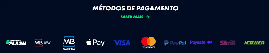 Caso realize um primeiro depósito por Multibanco ou MBWay, o subsequente levantamento será processado via Levantamentos Flash (transferência bancária). Se preferir pagamentos por cartão ou carteira digital, terá antes de proceder a um depósito usando esse mesmo método.