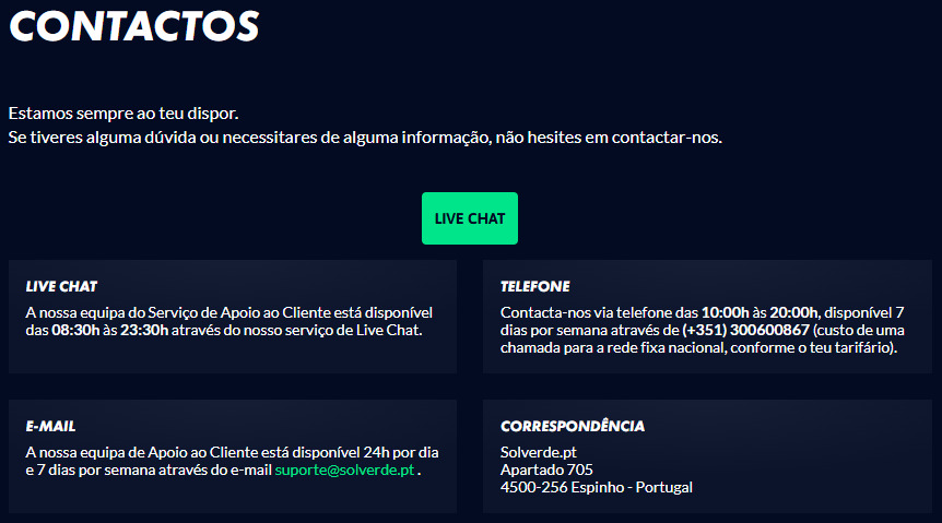 Os contactos da Solverde incluem: live chat, disponível todos os dias 8:30 às 23:30; telefone, disponível todos os dias das 10:00 às 20:00 - (+351) 300 600 867 -; e-mail, disponível todos os dias durante 24 horas - suporte@solverde.pt -; e correspondência - Solverde.pt, Apartado 705, 4500-256 (Espinho, Portugal).