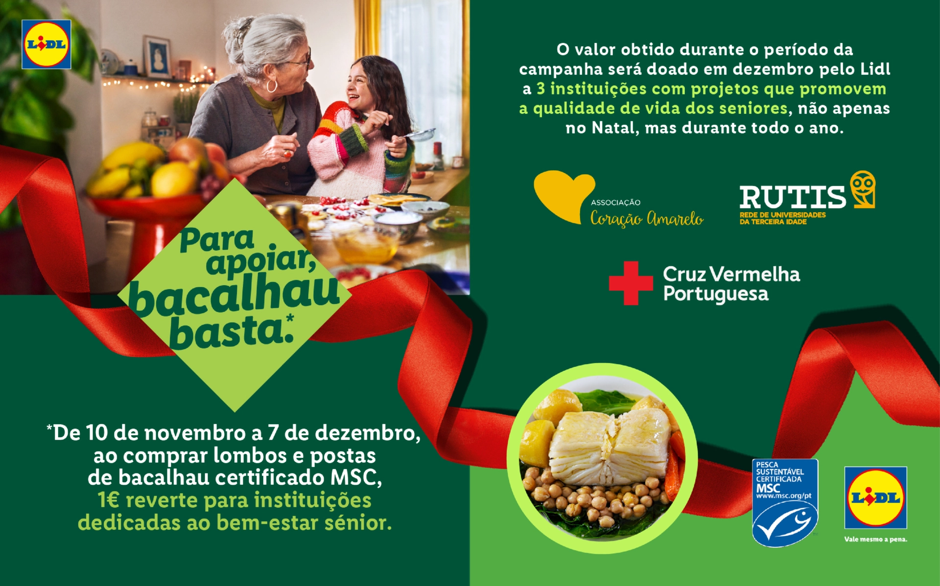 Com o mote "Cuidar de quem já cuidou de nós vale mesmo a pena", o Lidl Portugal tem em vigor uma campanha de solidariedade que visa apoiar três Instituições Particulares de Solidariedade Social (IPSS). Desde 10 de novembro e até ao dia 7 de dezembro, por cada embalagem de postas ou lombos de bacalhau certificado MSC vendida nas lojas Lidl, o valor de 1€ será doado para apoiar a Associação Coração Amarelo, a Cruz Vermelha Portuguesa e a RUTIS - Rede de Universidades da Terceira Idade. O valor total será dividido entre as três instituições, contribuindo para iniciativas que promovem a autonomia, o bem-estar e a integração na vida comunitária dos seniores.
