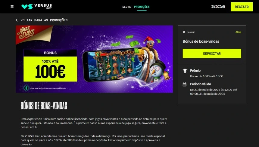 - O bónus de primeiro depósito da VERSUSbet permite reclamar até 100€ para jogar nas slots. Trata-se, pois, de uma promoção bastante competitiva, capaz de ombrear com outras plataformas de casino legal em Portugal.