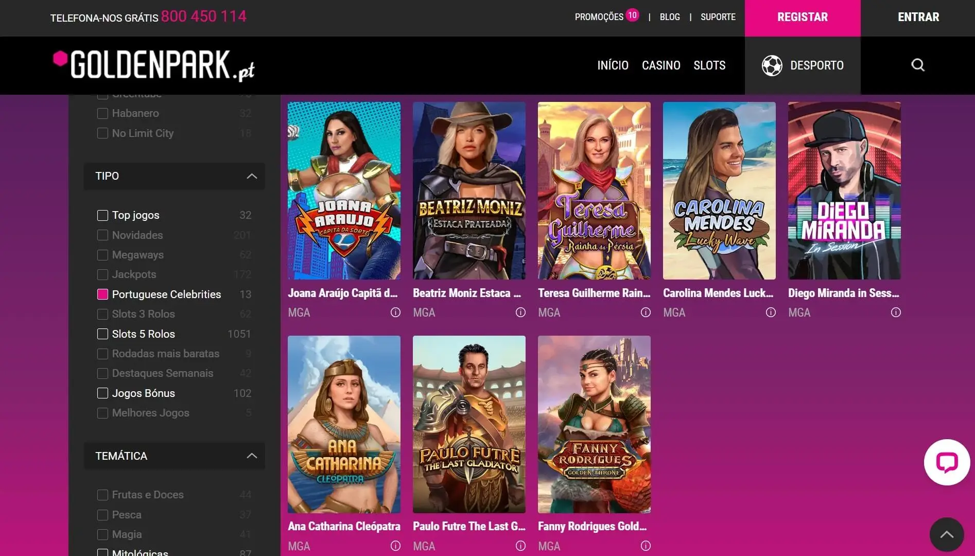 O catálogo deste novo casino online legal em Portugal inclui ainda uma categoria inovadora: celebridades portuguesas. Alguma vez pensou em passar uma tarde com Paulo Futre ou Teresa Guilherme? Pois pode fazê-lo - no conforto do seu sofá. Cortesia da MGA Games.