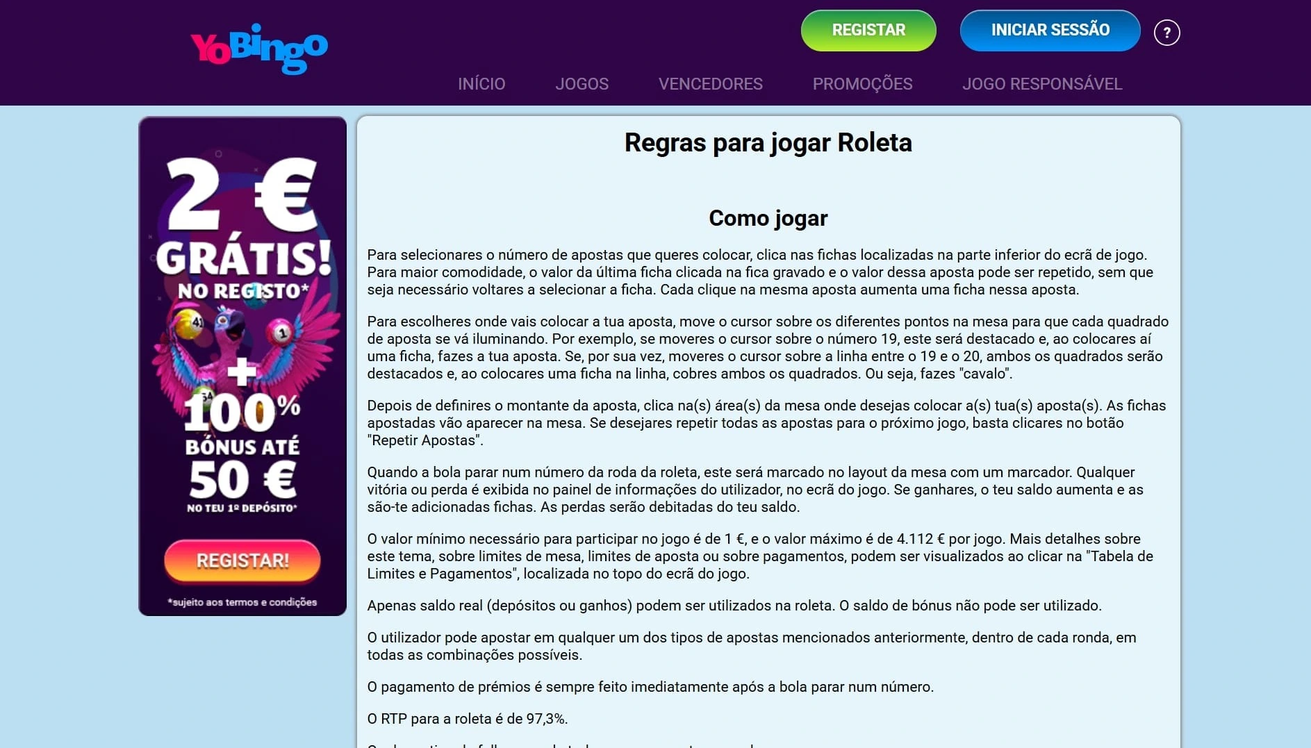 Por outro lado, o YoBingo inova. Além de ter roleta francesa, disponibiliza um tutorial completo para que possa aprender a jogar.