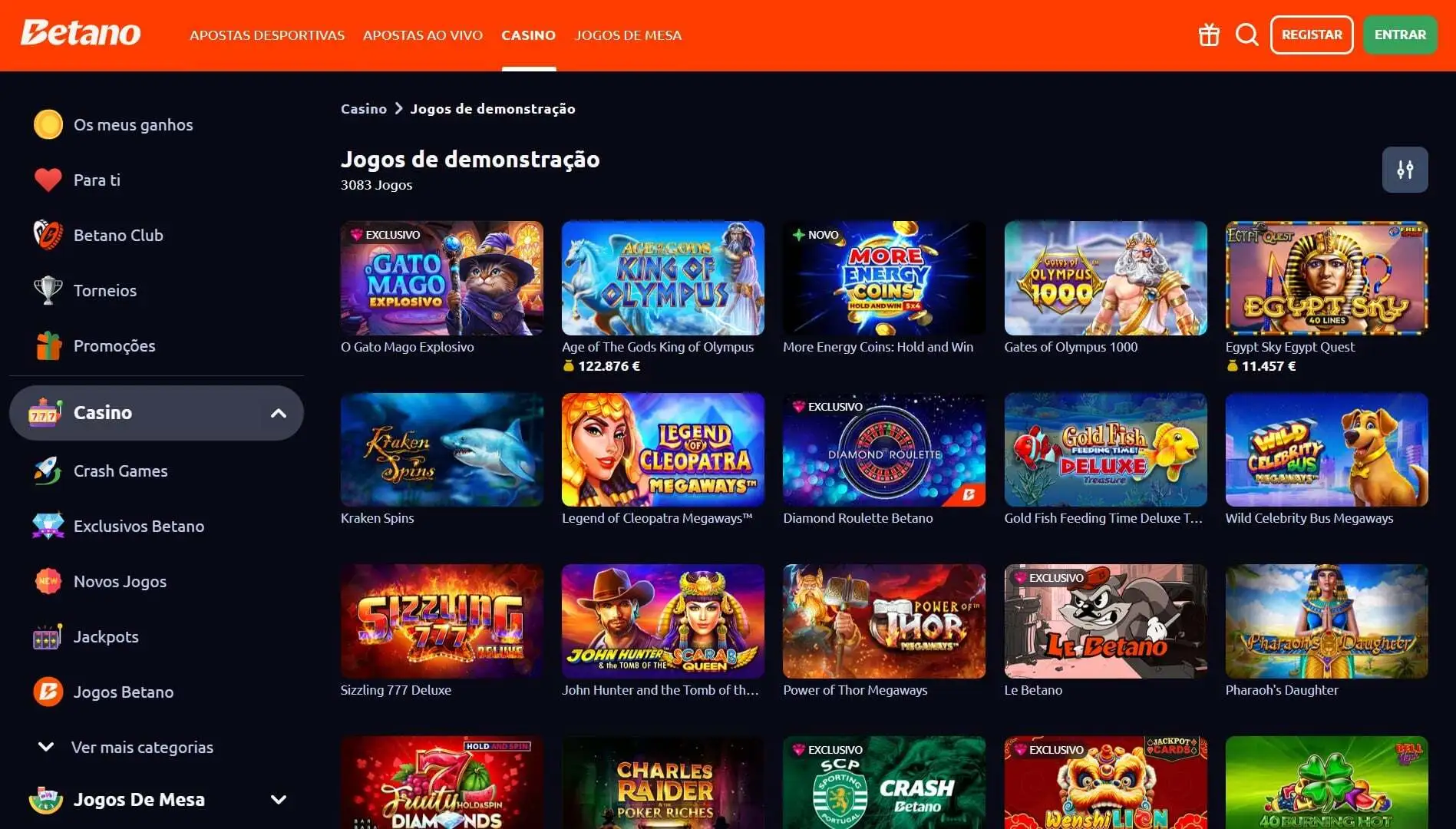 Registe-se, faça o login e aceda ao lobby de Casino da operadora. Pode fazê-lo através do browser ou da app da Betano. Clique no ícone de "Jogos de Demonstração". Aqui vai encontrar múltiplas opções de demo de slots grátis.