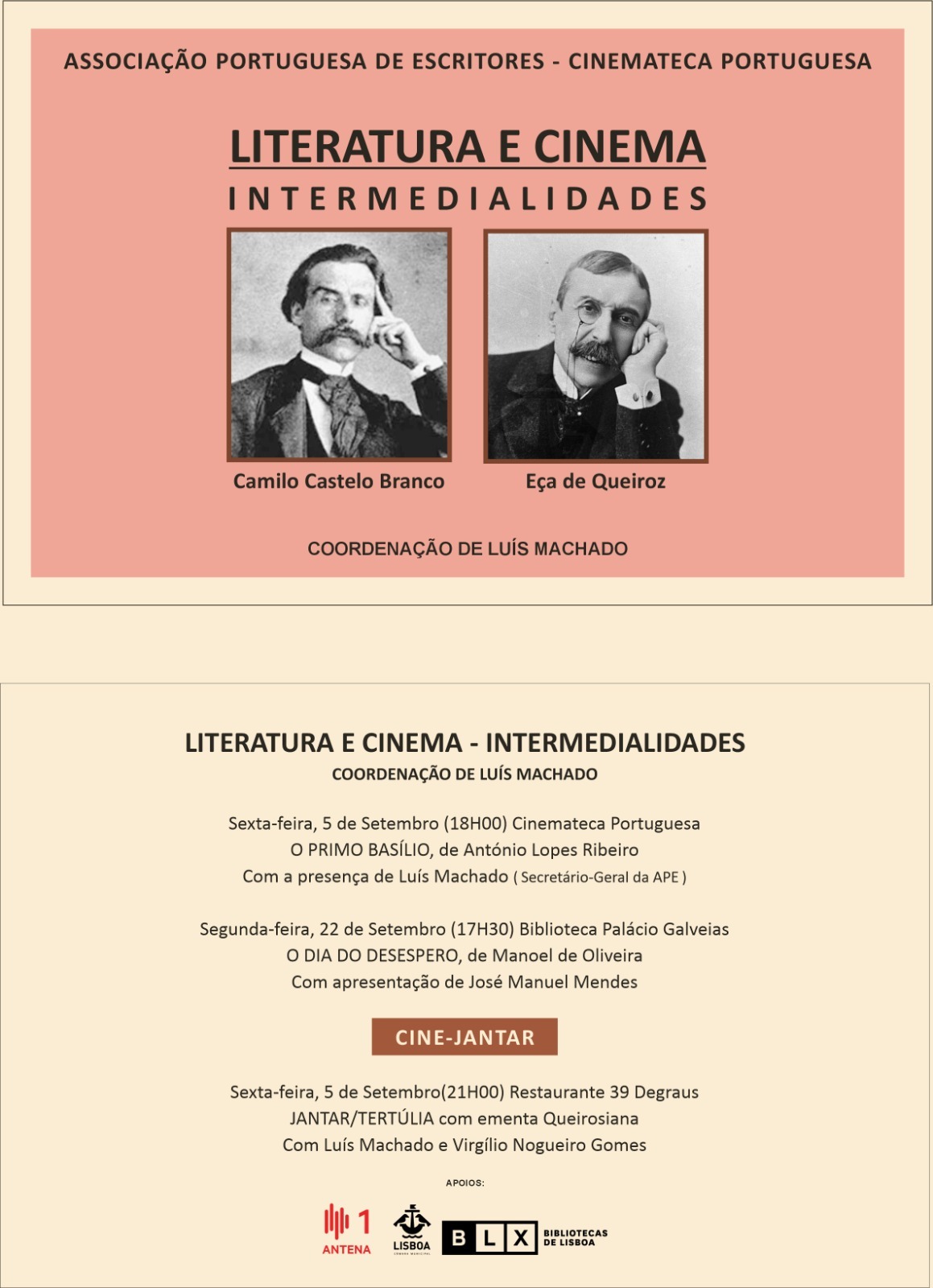 O bicentenário do nascimento de Camilo Castelo Branco coincide com os 180 anos de Eça de Queiroz. A Associação Portuguesa de Escritores, em parceria com a Cinemateca Portuguesa, junta os dois autores, organizando uma mostra de filmes a que chamou Literatura e Cinema - Intermedialidades. O evento, coordenado por Luiz Machado, Secretário-Geral da APE, arranca hoje e inclui um jantar com uma ementa queirosiana.