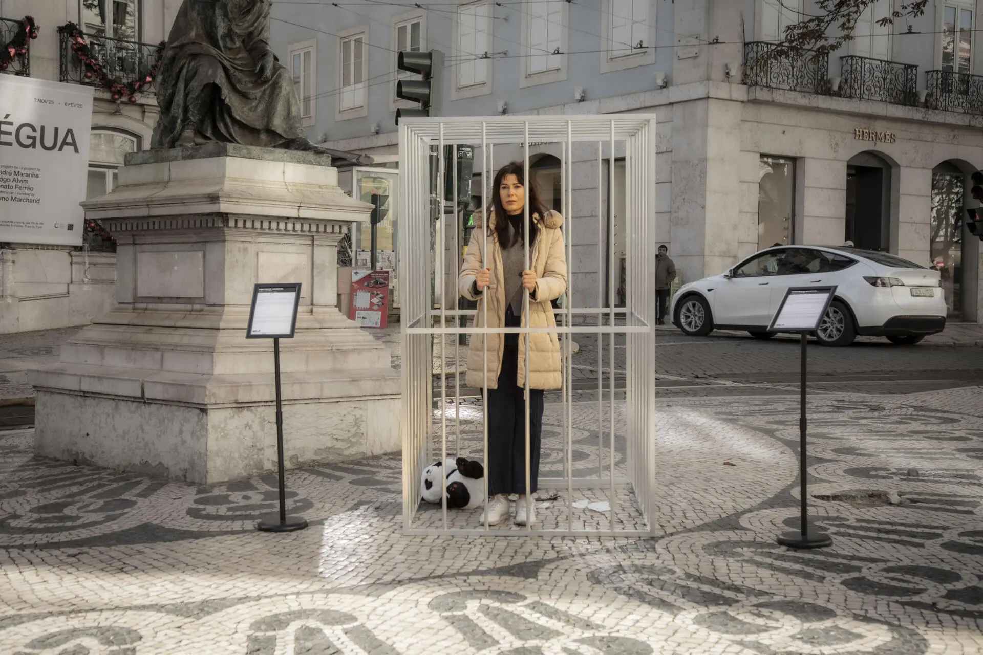 Uma mulher enclausurada, atrás de grades transparentes e à vista de todos, em pleno coração de Lisboa quer deixar bem clara a vida de mulheres vítimas de violência doméstica. Uma ação do artista SELF que junta Catarina Furtado e a associação a que preside, a Corações Com Coroa, para evocar o dia Internacional para a Eliminação da Violência contra as Mulheres.