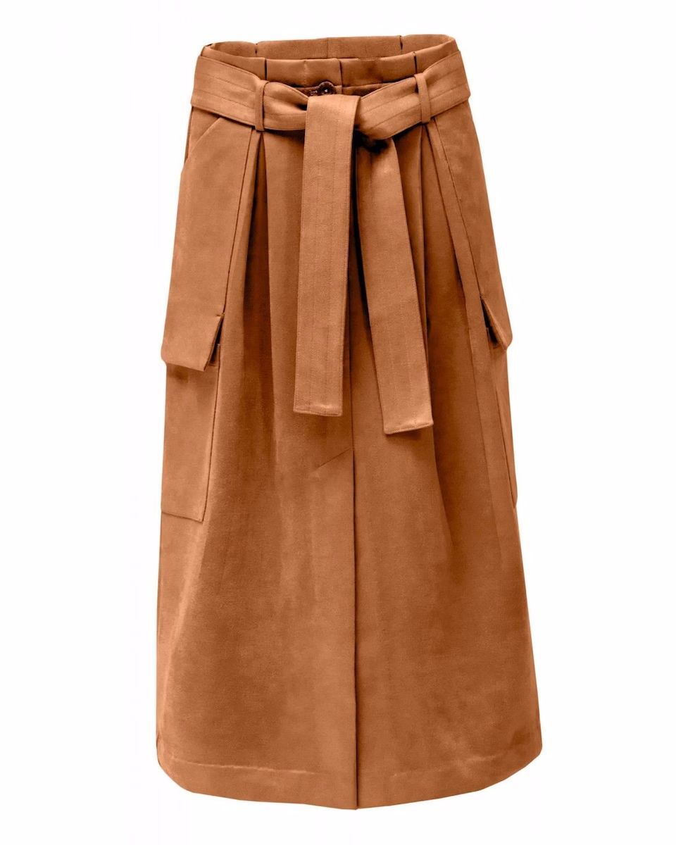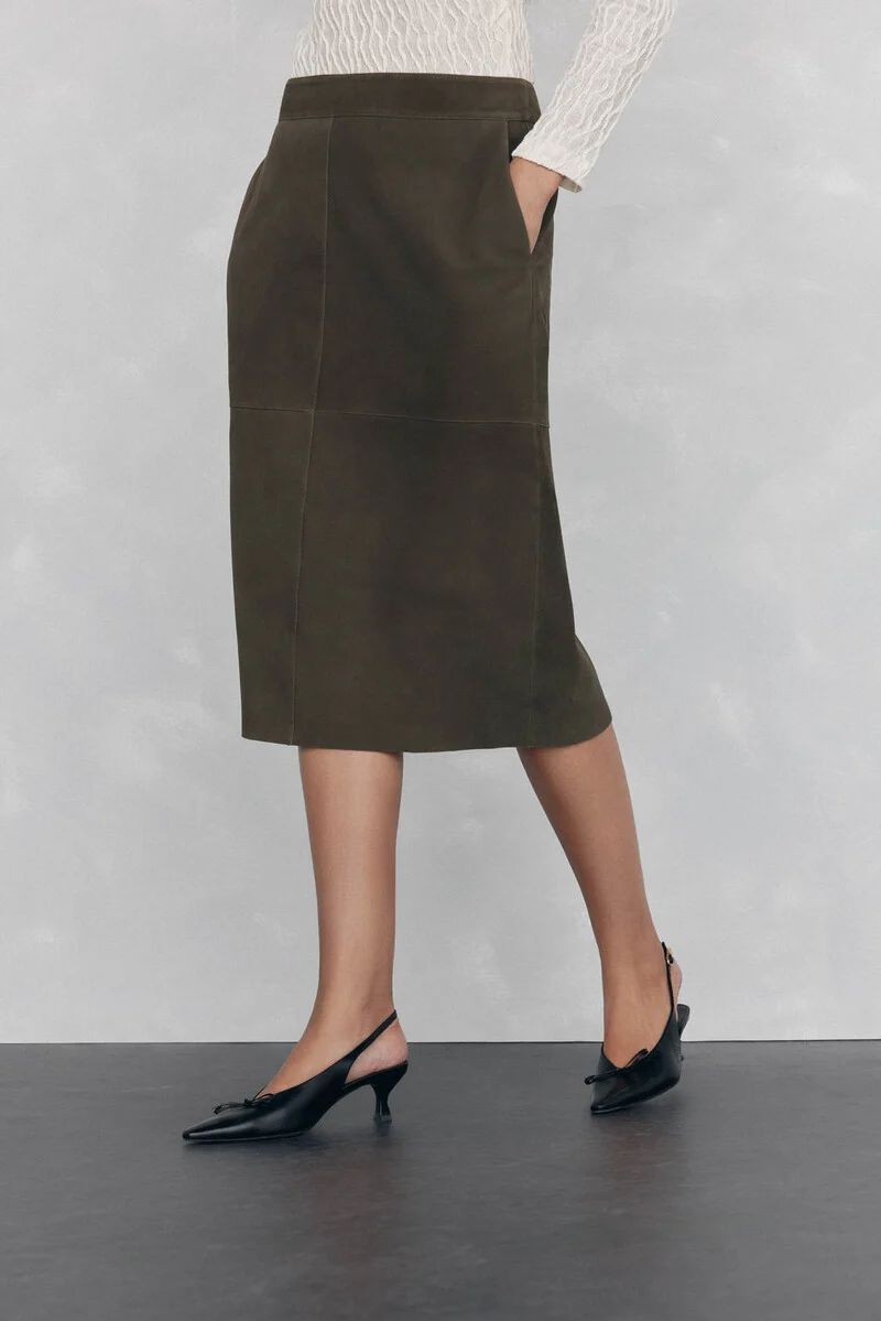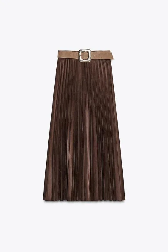 Saia midi plissada com efeito de camurça e cinto, Zara, 35.95€