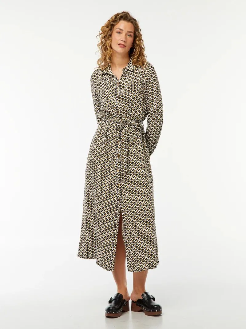 Vestido-camisa comprido estampado com cinto, Bege, Kiabi, 20€