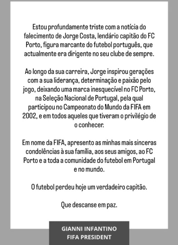 Gianni Infantino, presidente da FIFA, recordou esta quarta-feira Jorge Costa como "um marco inesquecível do F.C. Porto", um futebolista que "inspirou jogadores pela sua liderança, determinação e paixão pelo jogo".