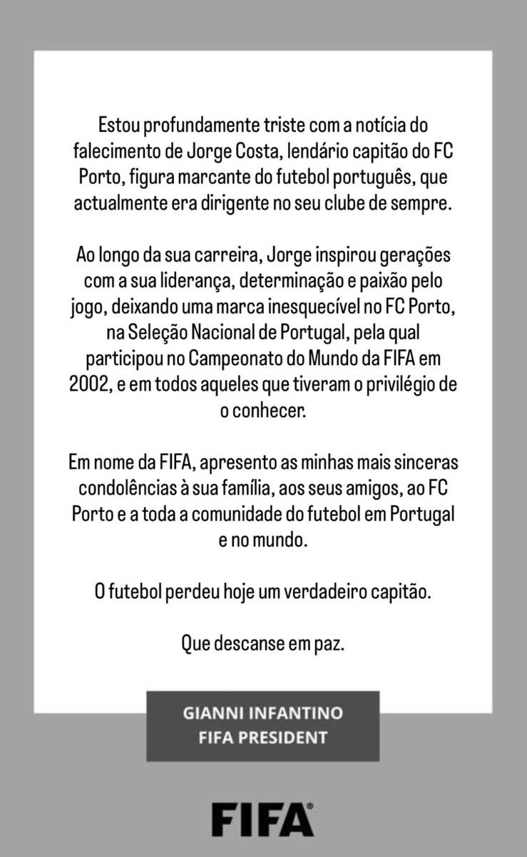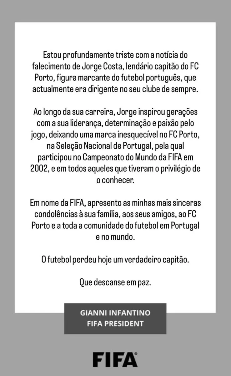 O presidente da FIFA, Gianni Infantino, publicou uma mensagem de pesar pela morte de Jorge Costa, dizendo-se "profundamente triste". "Ao longo da sua carreira, Jorge inspirou gerações com a sua liderança, determinação e paixão pelo jogo", referiu, acrescentando que hoje o futebol perdeu "um verdadeiro capitão".