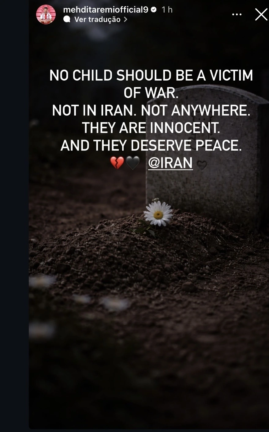 "Nenhuma criança deve ser vítima da guerra. Não no Irão. Não em lugar nenhum. São inocentes. E merecem paz", escreveu o internacional iraniano, numa mensagem curta e centrada no impacto dos conflitos armados sobre os mais novos.