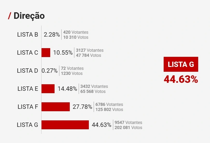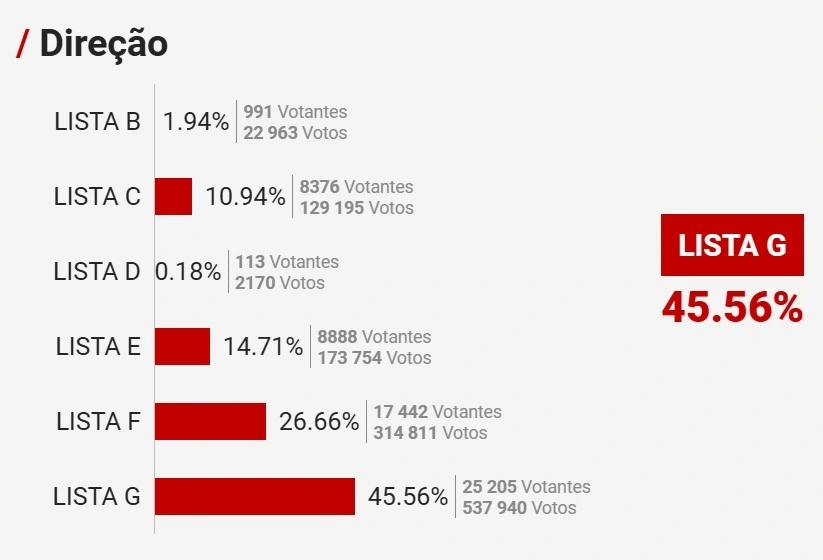 Lista G, liderada por Rui Costa, foi a mais votada (42,13%), mas não alcançou a maioria absoluta, indo a uma segunda volta contra a Lista F, encabeçada por João Noronha Lopes (30,26%). Neste cenário, o segundo sufrágio fica marcado para 8 de novembro.