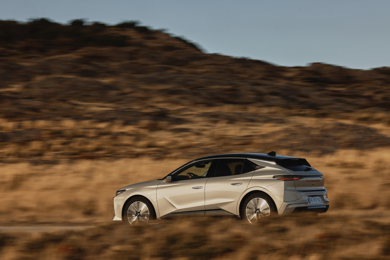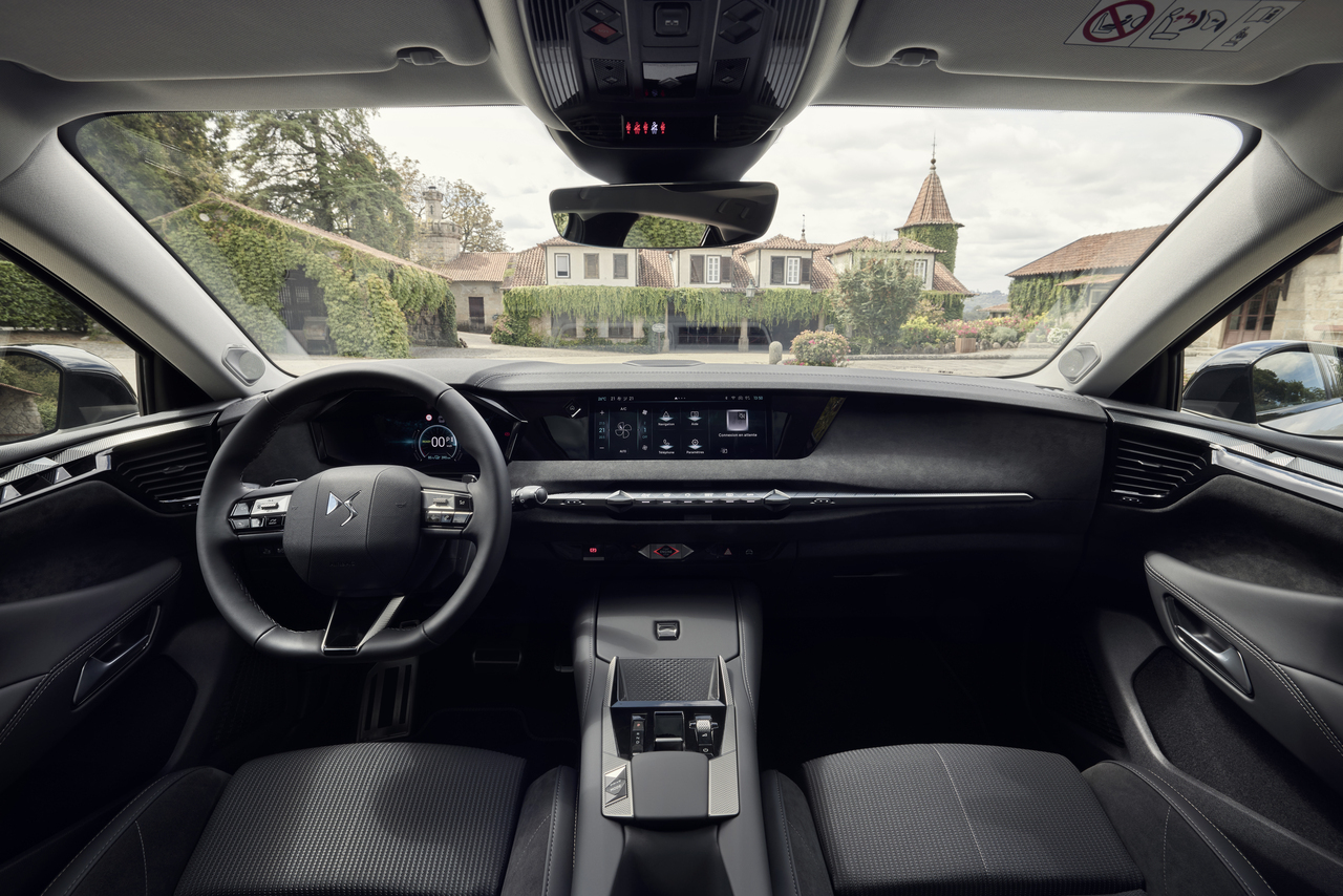 As jantes de 19 ou 20 polegadas conferem robustez e dinamismo à presença em estrada, enquanto o tejadilho contrastante e os detalhes cromados na zona envidraçada acentuam a sofisticação. A traseira é igualmente expressiva, com óticas LED tridimensionais e a inscrição DS Automobiles gravada na tampa da bagageira, sublinhando o posicionamento Premium do modelo.