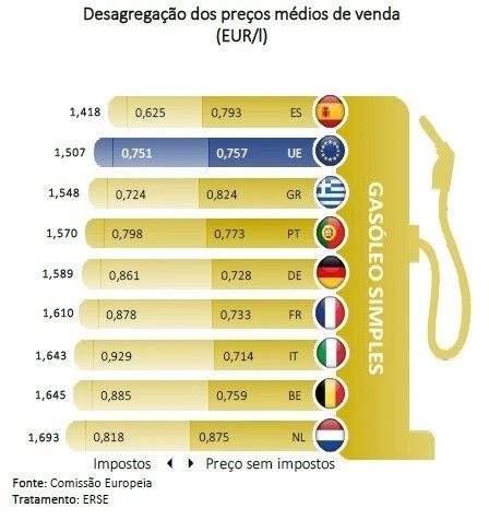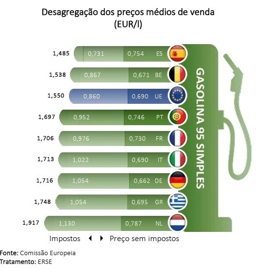 A comparação com a média europeia expõe duas realidades paralelas. Por um lado, os preços "antes de impostos" ajudam a perceber a componente de custos de produto e logística: na gasolina, Portugal apresenta 0,746 €/l, face a 0,690 €/l na UE-27 - uma diferença de 5,6 cêntimos por litro. Por outro, é a carga fiscal que acaba por cimentar a divergência. Na gasolina 95 simples, os impostos representam 56,1% do preço final em Portugal, face a 55,2% na média europeia. Esta diferença aparentemente pequena ganha escala no preço final, sobretudo quando comparada com mercados próximos como o espanhol.