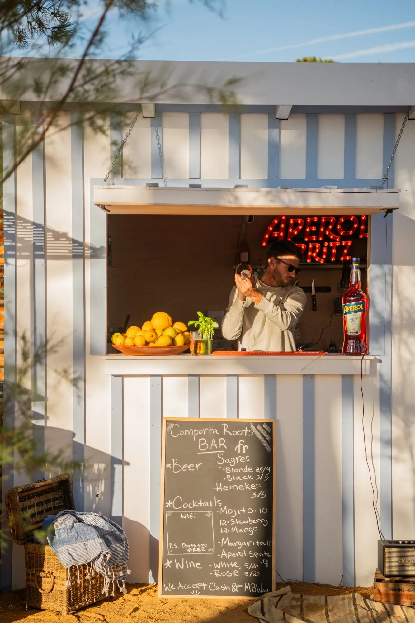Ao lado fica a cabana da Oxalá Brunch, com soluções de pequeno-almoço tardio - leia-se taças de fruta, tostas, sandes e afins - a partir das 9 horas. No oitavo espaço, potenciais investidores ou simples curiosos podem consultar informações acerca do projeto imobiliário Atlantic Club Comporta. Até ao ano passado, a aldeia do Carvalhal estava em falta em matéria de lojas, boutiques e animação, reforça Louie Thain. Agora na segunda edição, o Lusa Market procura colmatar essa falha com um recinto colado à Rotunda das Praias, na Lagoa.