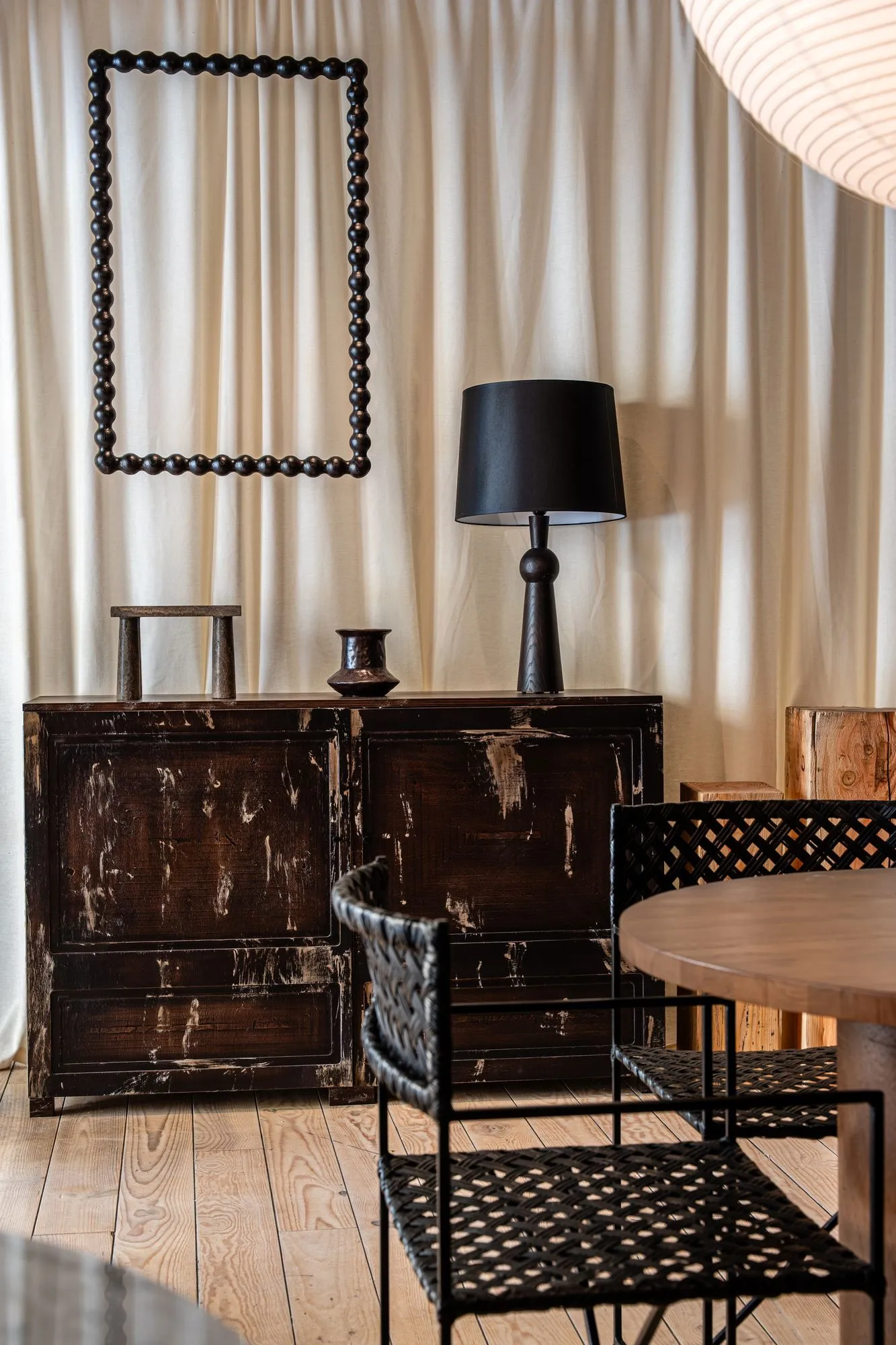 A decoração do boutique hotel, assinada pelo Bacana Studio, destaca-se pelos tons escuros e pela mistura de "materiais nobres, texturas envolventes e uma paleta cromática serena", descreve a chic&basic em comunicado. E, sobretudo, pelas cortinas, que influenciam a perceção visual do espaço. Os 14 quartos localizam-se nos três pisos superiores e têm todos janelas viradas para a Rua das Farinhas, de onde se pode facilmente partir à descoberta do centro histórico de Lisboa, entre o castelo e os quarteirões pombalinos.