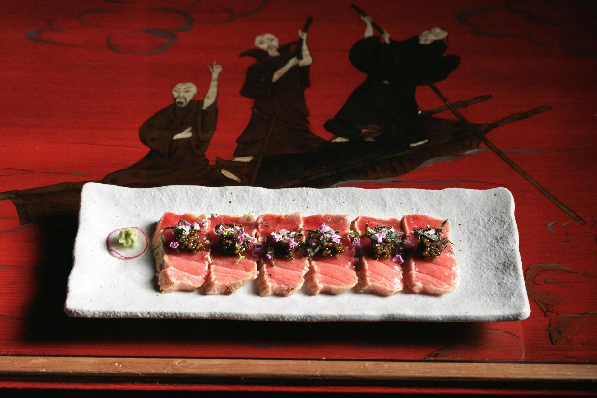 Do menu destacam-se, nas entradas, o robalo com molho de vinagre de flor de cerejeira e óleo de sésamo; e o atum marinado em soja e mirim, caviar e shiso, por exemplo. Na lista de nigiris, há enguia e wagyu com trufa, além de outros peixes, e é possível pedir um conjunto de seis. Já quem preferir entregar-se ao chef pode também pedir o Maguro Feast, que traz uma seleção alargada de sashimi, nigiri, temakis, hosomaki e uramakis. O wasabi fresco e o gengibre estão incluídos.