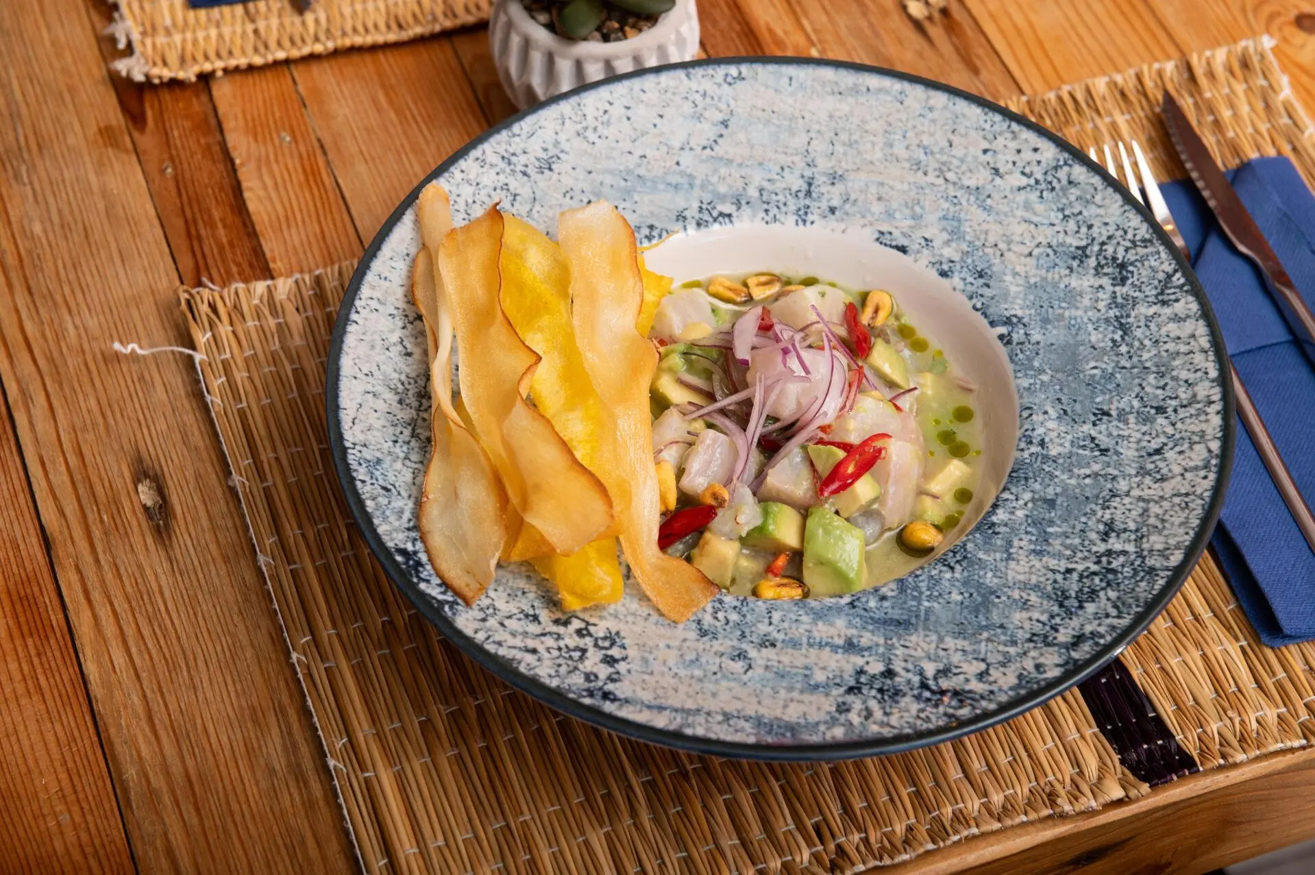 Mas isto é já um twist, tal como acontece noutros pratos tradicionais da carta. "Adaptei-o ao meu gosto e a Portugal; normalmente o prato é recheado com torresmo e não tem molho", diz. "É o meu prato preferido", intervém Tatiana. "Já mudamos três vezes de carta, mas há pratos que nunca saem: o guacamole, o ceviche e o mofongo." O primeiro, refere Luís, "é simples, mas não é assim tão fácil encontrar o equilíbrio entre os sabores. Faço sempre no momento para manter a frescura e a ligeireza deste prato mexicano". Um dos pratos que mais o distingue, considera, é o seu ceviche, pela "frescura, delicadeza, empratamento, e sobretudo, pelo "leche de tigre"" (o molho à base de lima), preparação que tem desenvolvido nos últimos anos. Ao peixe branco cru (dourada) e ao camarão, junta-se a crocância do milho frito e a suavidade do guacamole. A acompanhar o prato peruano há chips de banana-pão e de madioca.