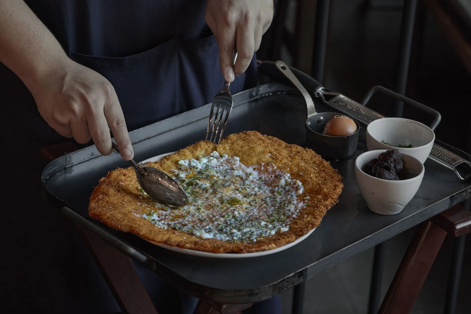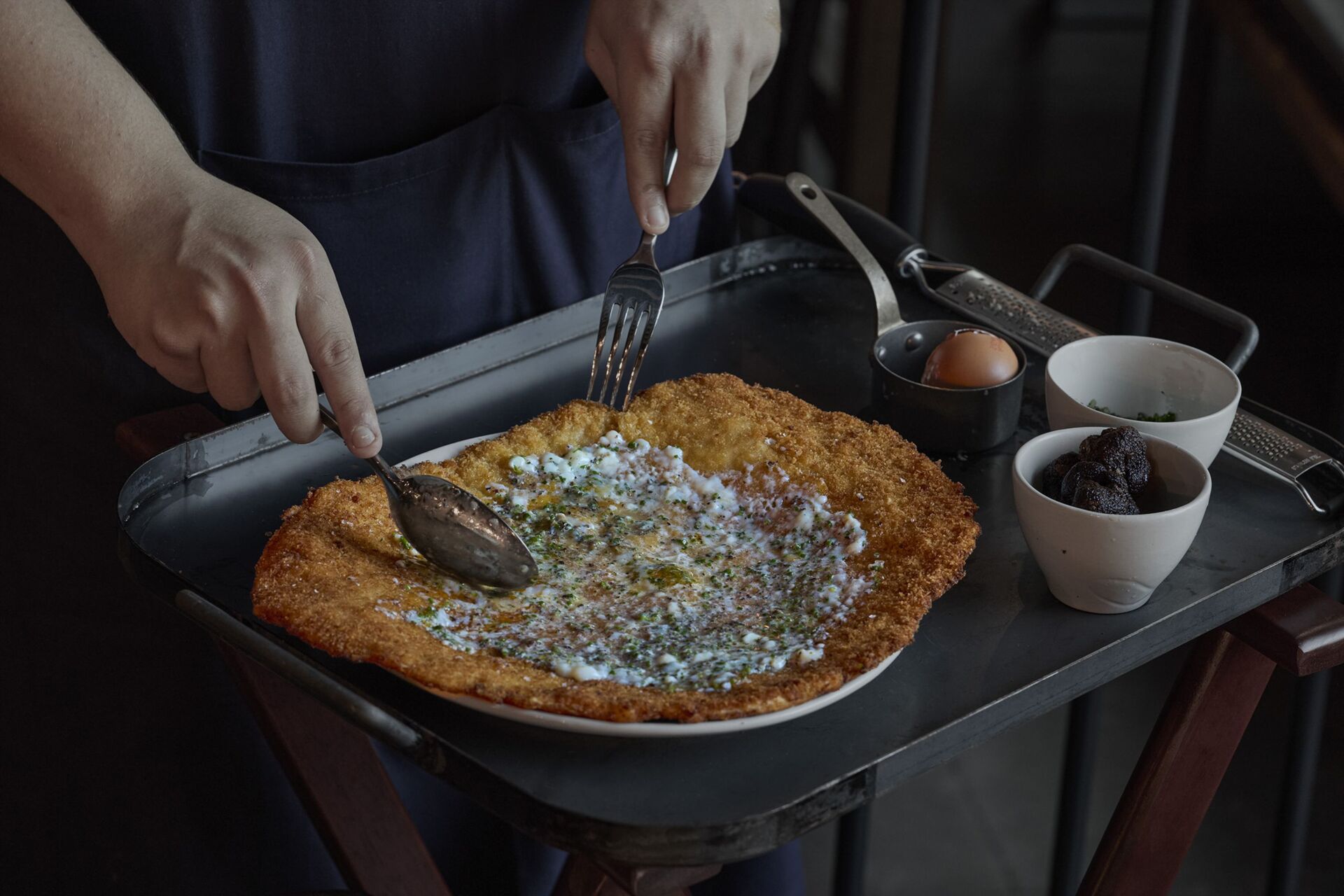 Uma das estrelas da carta é o escalope San Román, o panado de dimensões generosas que leva ovo e trufa, e que está no menu desde o arranque do espaço em Madrid. Outras propostas são a bocata de orelha de porco crocante com salsa brava; a tarte tatin de alho-francês e mortadela fumada; a dourada de esteiro com amêndoa e uva tinta; a burrata com cecina fumada e nectarina grelhada; as cenouras braseadas com caril de kalamansi e toranja; o ceviche de curgete e beterraba; o arroz malandro de choco e caranguejo frito; o lírio com aguachile de espinafres e ervilhas-tortas; o bife tártaro da casa, com torrada de massa-mãe; ou a tortilha de bacalhau, batata e pimentos assados, este último um dos pratos que só se provam em Lisboa.