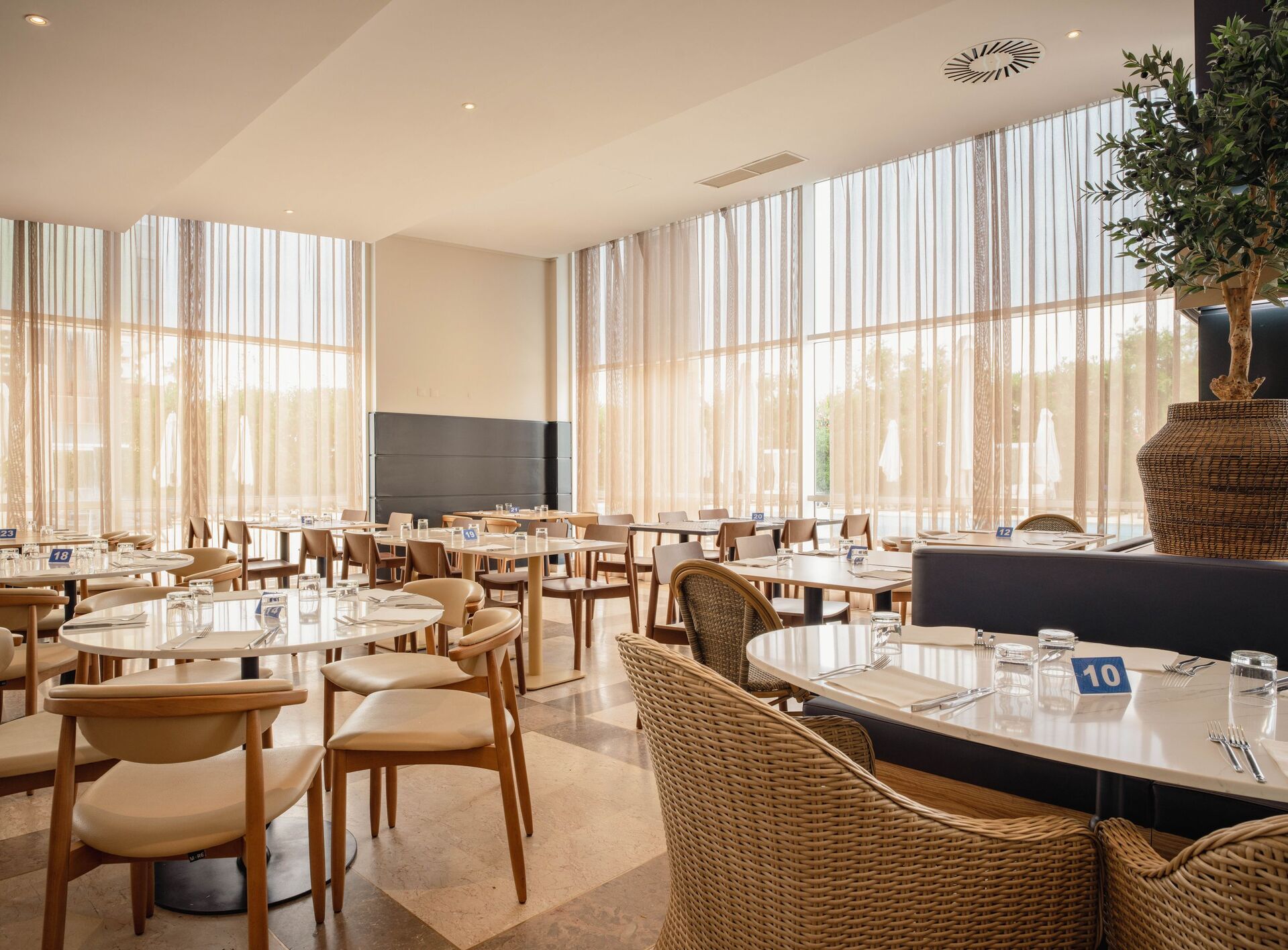No oitavo piso está também o restaurante Horizonte, cujo nome deixa adivinhar o atributo que o torna singular: a vista panorâmica, que em dias limpos vai da serra de Sintra ao cabo Espichel. Na sala agora em tons de azul e bege, o pôr-do-sol - que no bar ao lado parece estar vertido no copo - é um momento digno de fotografia, enquanto chegam à mesa os pratos de matriz local e nacional do chef de cozinha Luís Romão. Entre as opções há, por exemplo, amêijoas à Bulhão Pato; salmão à pescador com dois purés; lombo de pampo com arroz do mar e pratos veganos.