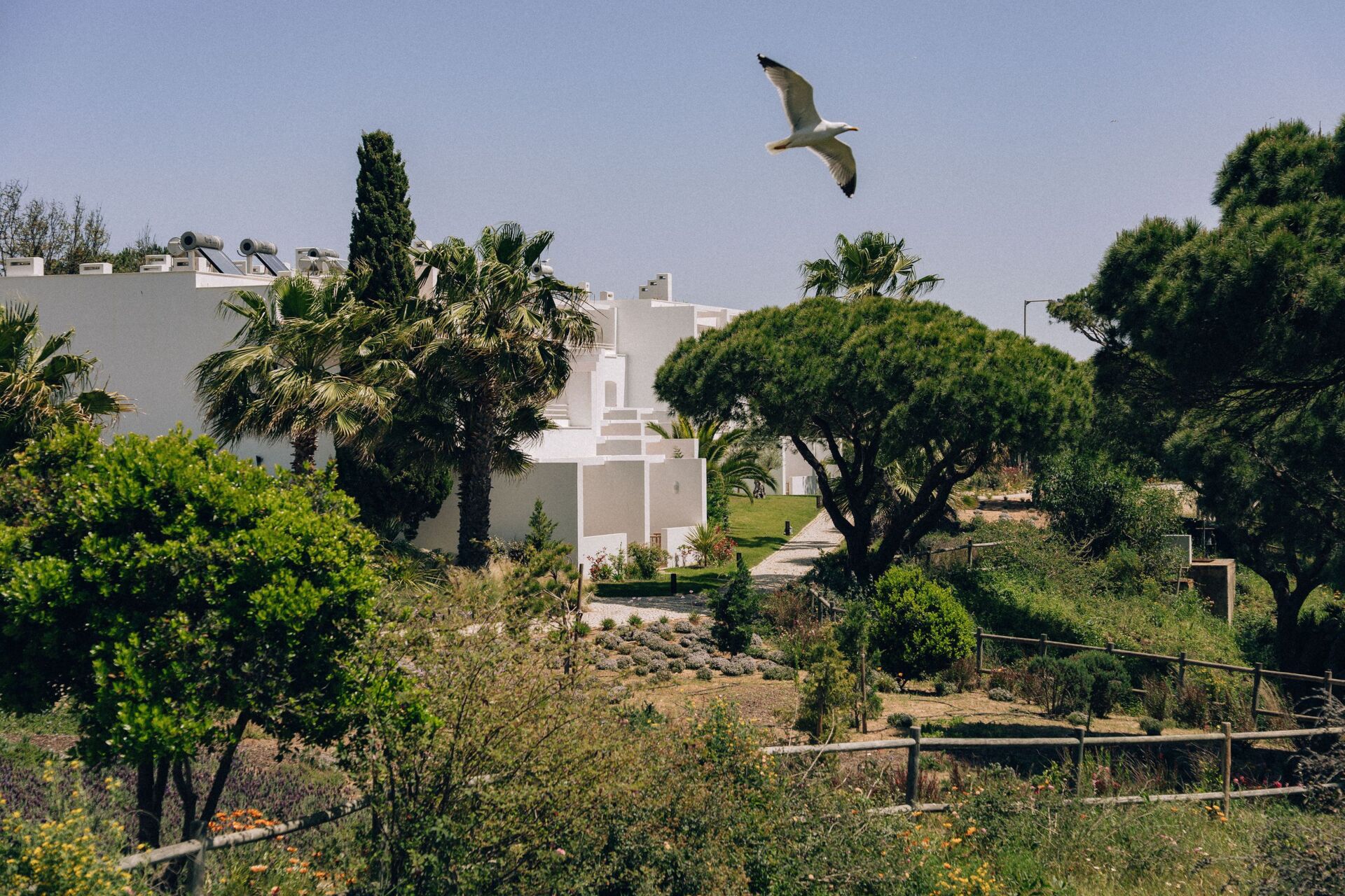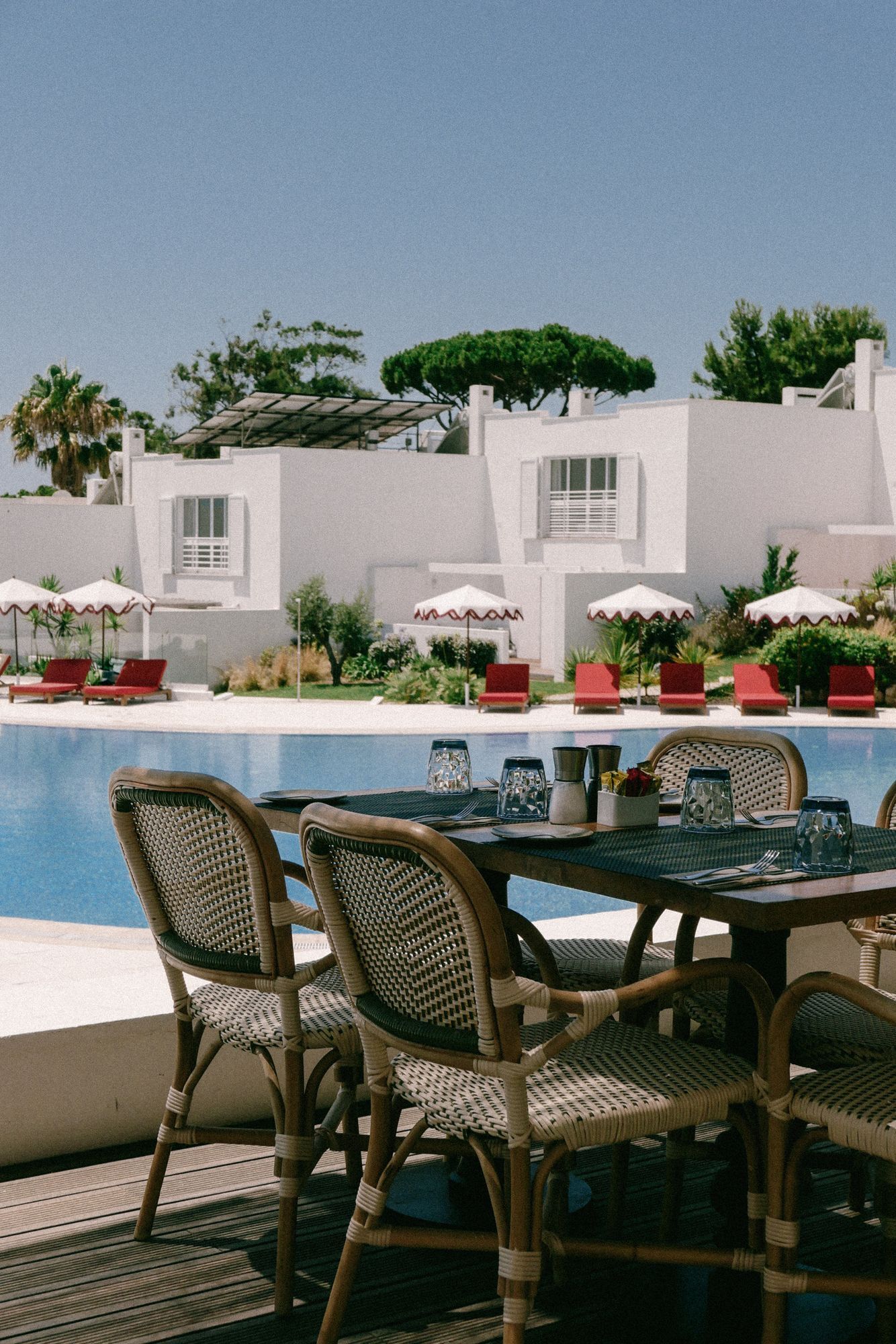 Depois do check-in - no qual todos os hóspedes recebem um voucher com uma bebida de cortesia para desfrutar durante a estadia -, e uma vez estacionado o carro no lugar atribuído, um elemento da equipa leva os clientes até ao apartamento, com uma cesta na mão. "Na mesa, colocamos sempre um cartão de boas-vindas, duas laranjas ou tangerinas e duas maçãs, duas fatias de bolo de laranja e duas águas", explica o diretor-geral António Ferreira. A partir daí, a experiência quer-se serena, tirando partido do sossego palpável em todo o resort.