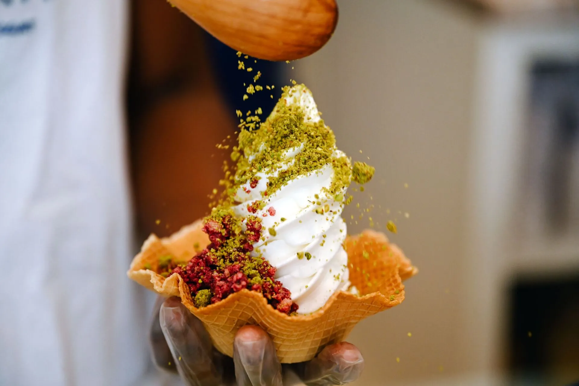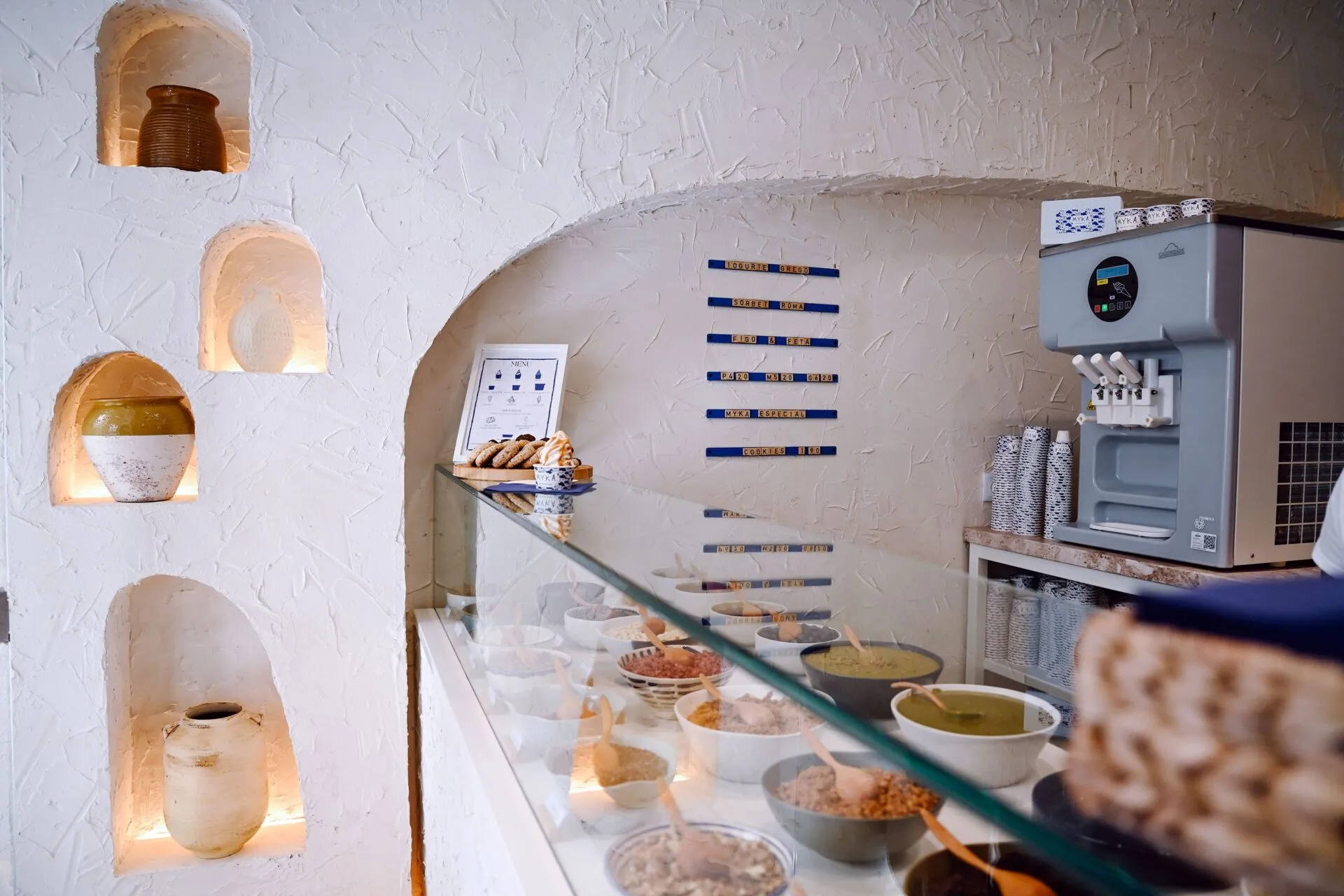 A experiência foi desenhada para ser simples e direta. Primeiro, escolhe-se o formato, entre copos pequeno, médio ou grande, cones de bolacha (um deles com chocolate e pistacho no rebordo) e taça de bolacha. Depois, o funcionário da loja coloca as coberturas sobre a espiral de iogurte grego tirada da máquina. Existem cerca de 30 opções, como frutos secos, massa kadaif (típica da Grécia e do Médio Oriente), chocolate e avelã, crumble de frutos vermelhos, granulado de pistacho e baklava (doce grego e turco), dispostas em taças a lembrar as tagines.