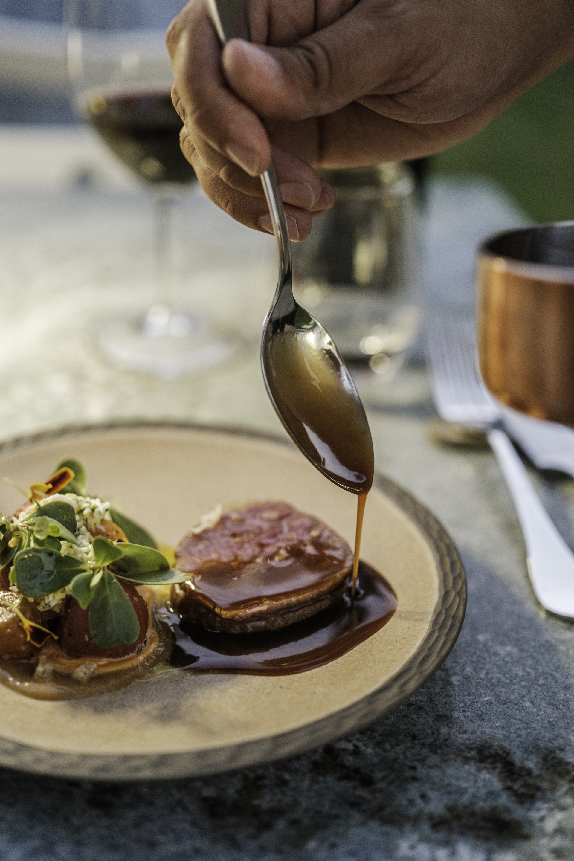 Chega depois à mesa a corvina com uma esmagada envinagrada de batata de Chaves - o ingrediente preferido de Vítor Adão, de resto -, picle de curgete e cenoura salteada, emparelhado com outro vinho do chef, o Ding Branco Assinatura 2020, blend de vinhas velhas criado em Monção. Segue-se o momento de carne, um lombo de vaca barrosã grelhada e fumada, tomate Coração de Boi em várias texturas e acelgas com vinagre de Vinho do Porto, altura em que chega à mesa o alentejano Dong Tinto 2020, um blend de Syrah e Alicante Bouschet criado em conjunto com a Herdade da Figueirinha.