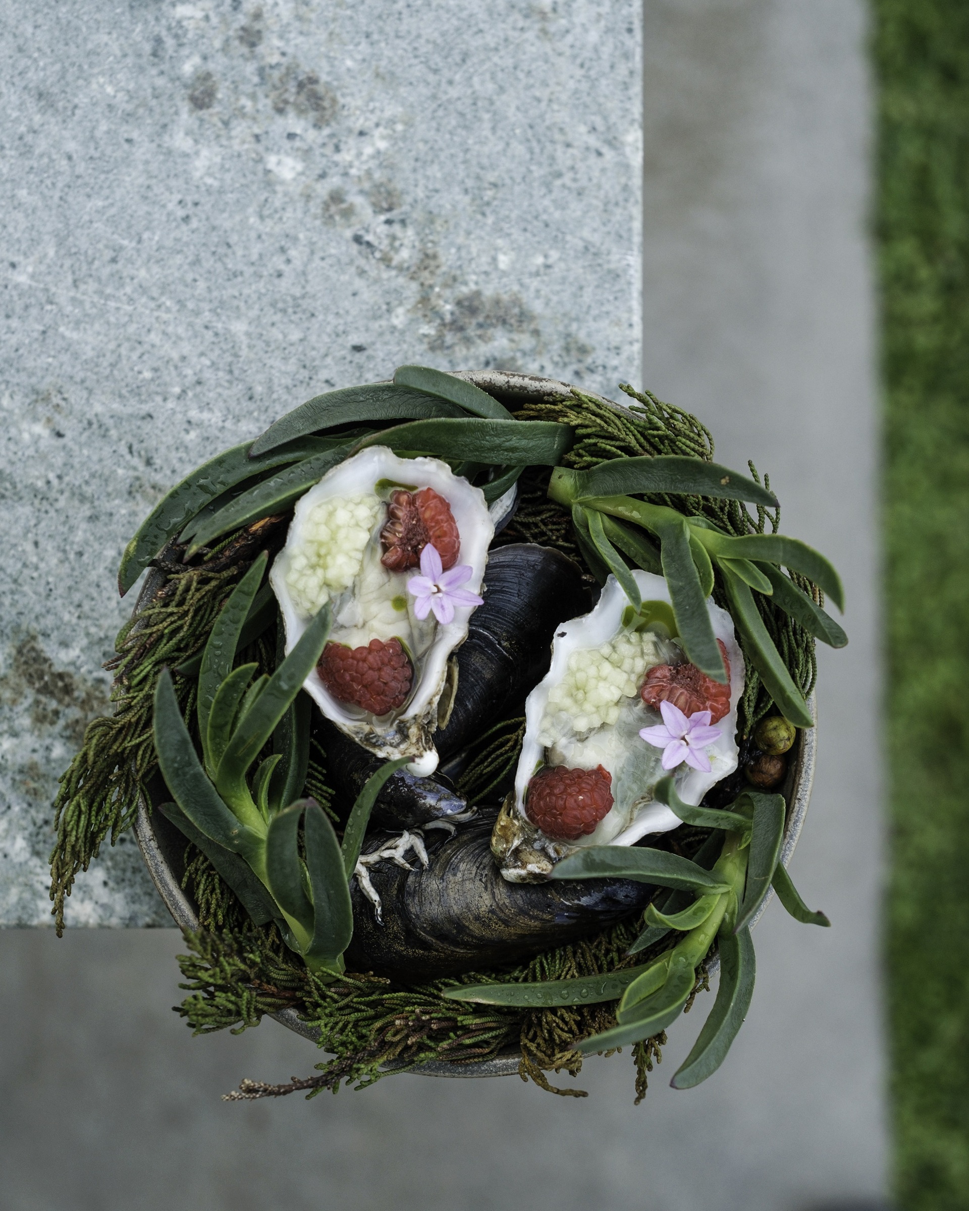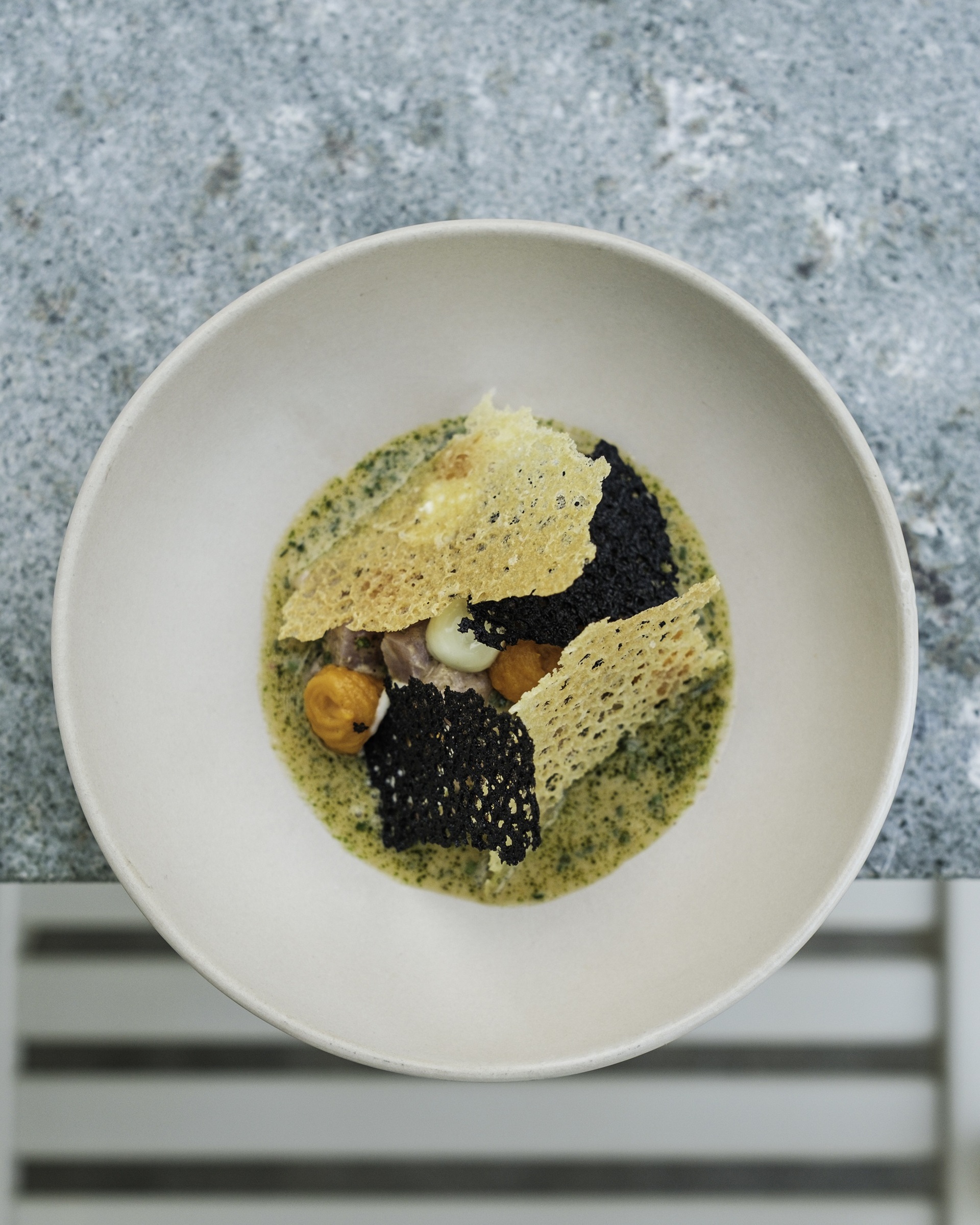Como pedem os dias veranis, há muito mar a inspirar o menu de degustação No Jardim, composto de cinco momentos. O arranque faz-se à boleia das ostras da costa de Sagres, servidas com sucos de diferentes citrinos, maçã, flor de alho e vinagrete de romã, oportunidade para harmonizar com um Vinho Verde, o Ding Branco 2020, produzido em parceria pelo chef e pela enóloga Joana Santiago. A frescura mantém-se elevada com o tártaro de atum, que vem acompanhado de puré de batata-doce, amendoim caramelizado, maionese de wasabi, leche de tigre (a versão da casa com leite de coco, caril e citrinos) e telhas de pão crocantes, algumas com tinta de choco.