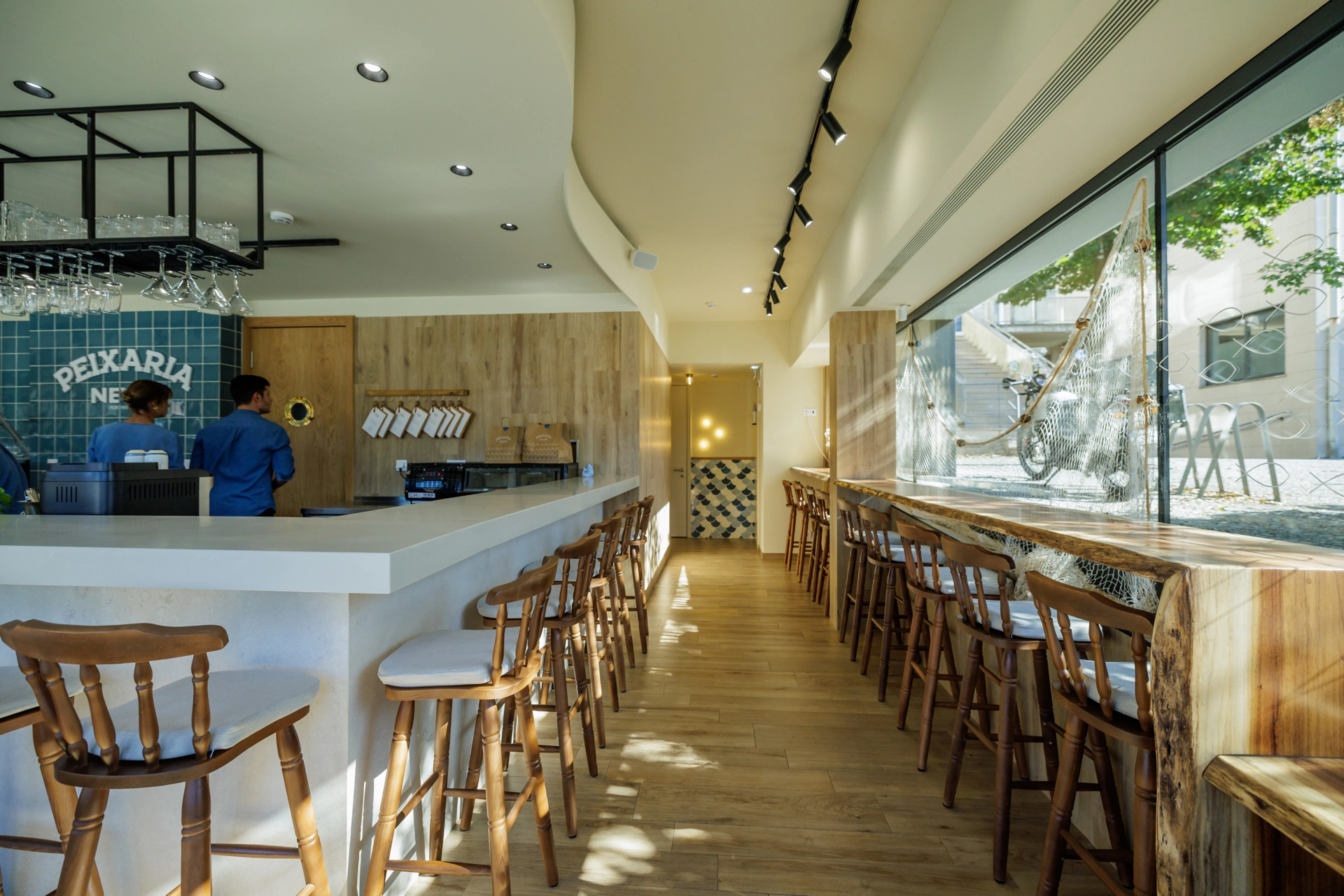 As paredes envidraçadas deixam ver todas as vertentes da loja, unidas sob a mesma identidade visual, que mantém os icónicos azulejos azuis na parede de fundo, conjugados com uma decoração convidativa, que lembra o mar e a pesca. Logo à entrada fica a banca da peixaria, preenchida com o pescado que ali chega diariamente da lota da Póvoa de Varzim e de Viana do Castelo. Ao lado, o balcão do sushiman, e mais ao fundo uma zona de refeições com bancos altos, e um cantinho à medida das crianças, com puzzles, jogos e lápis de cor.