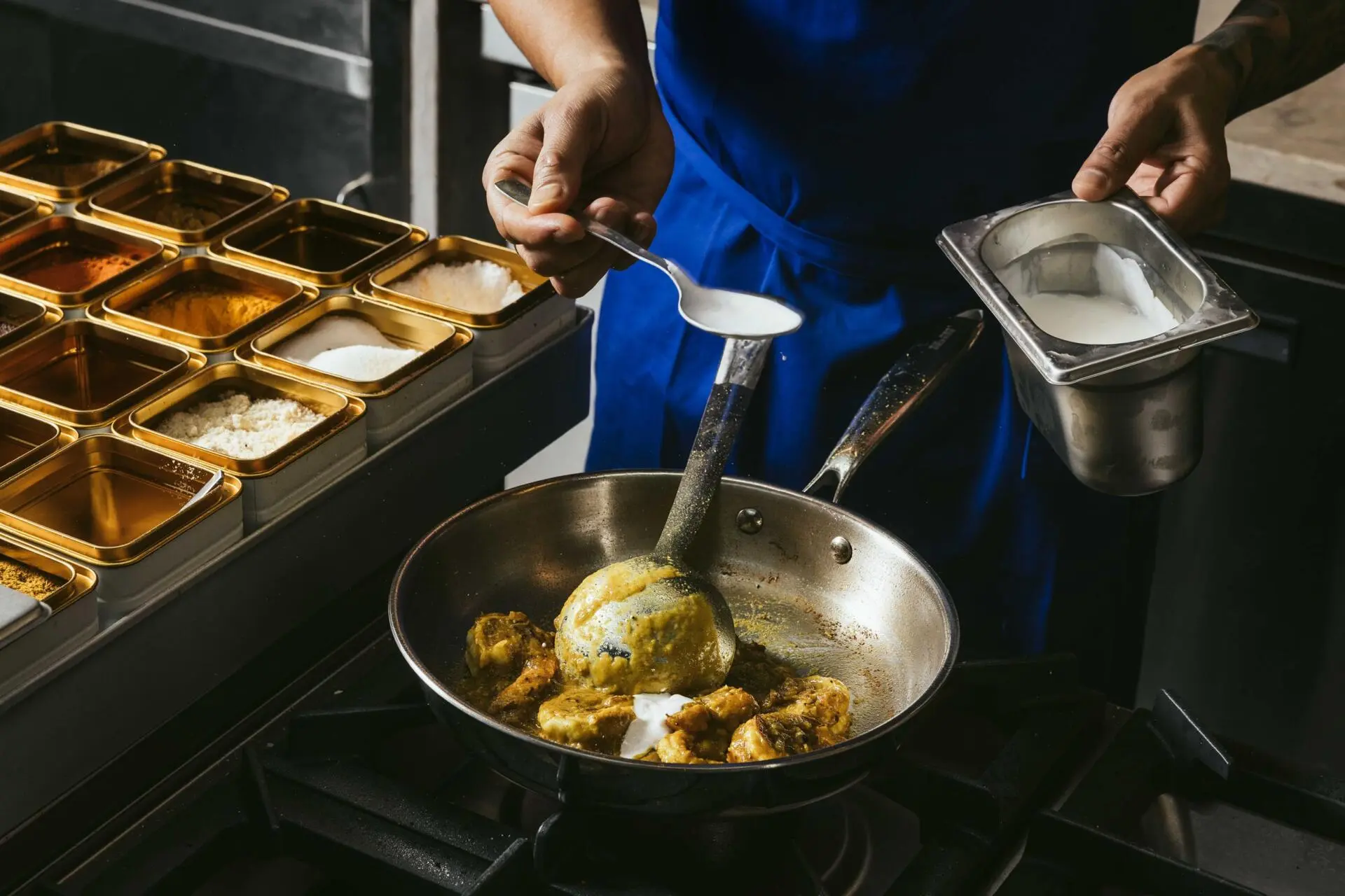 "Os nossos caris seguem as receitas clássicas", introduz de seguida o chef Hari Chapagain. Há cinco opções: butter chicken (de frango com manteiga, amêndoa, tomate e especiarias), madras chicken/lamb (de frango ou borrego, com especiarias aromáticas, coco e folhas de caril), goan prawn (de camarão goês com leite de coco, tamarindo, folhas de caril e sementes de mostarda), borrego e uma versão vegetariana com vegetais frescos da temporada. Os caris podem ser acompanhados com arroz basmati aromático, cozinhado a vapor no momento.