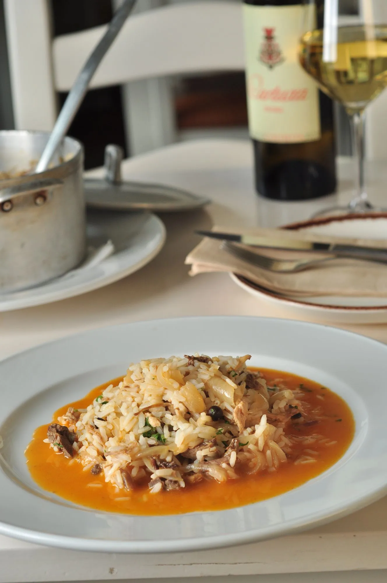 Arroz de cabidela no pote, com frango de campo e sangue avinagrado.