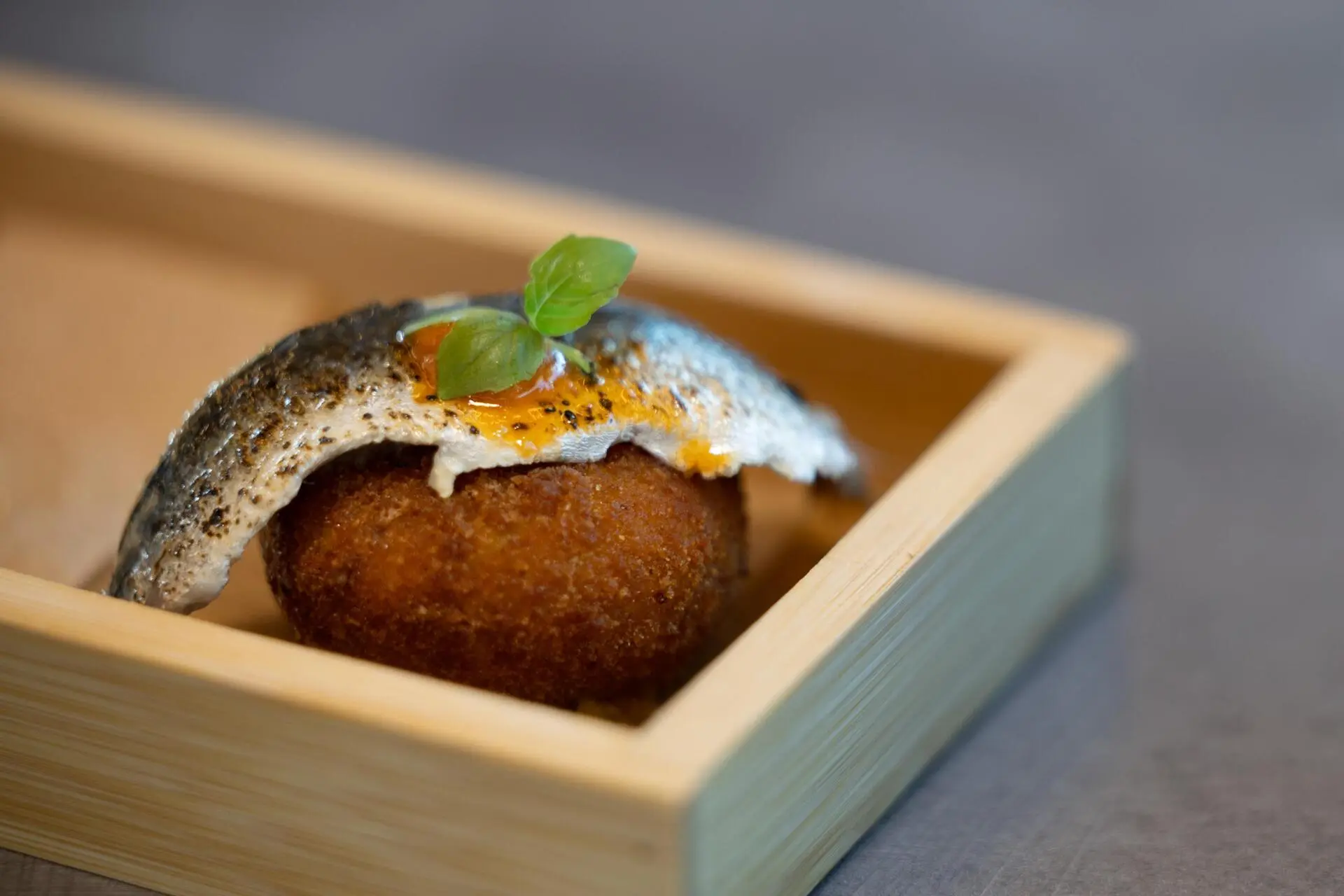 Ao assumir a elaboração da carta, passou a criar petiscos e pratos inspirados na tradição portuguesa, como a sardinha fresca de São João. Nesta proposta, a sardinha - com a espinha retirada e curada em sal - repousada sobre um pastel de milho, reinterpretando o clássico pastel de bacalhau, e coroada com um creme de pimentos assados, triturados com azeite e alho, que equilibra o contraste entre o doce e o salgado.