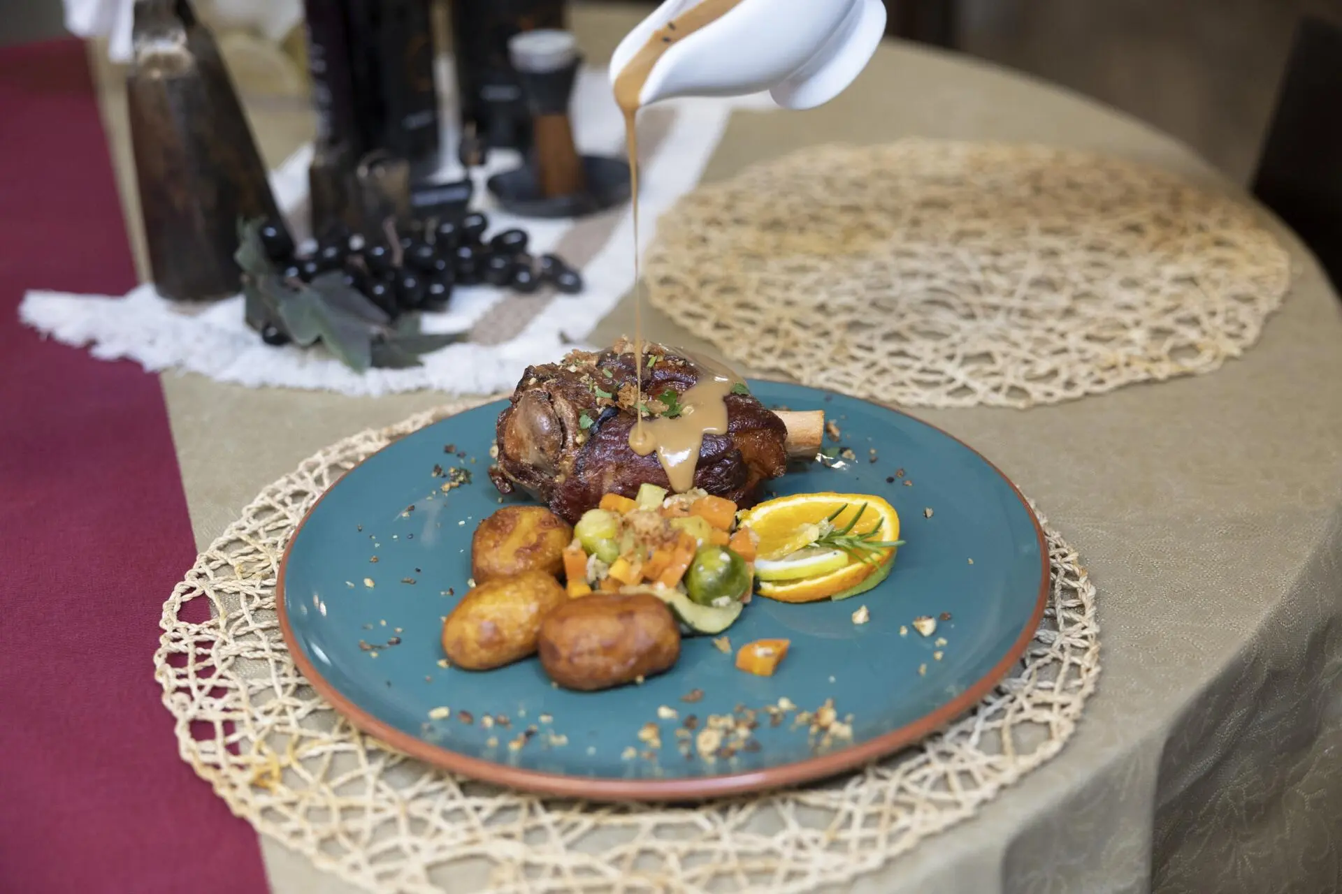 Nos pratos de carne, a escolha é variada. Há um fantástico arroz de pato à antiga, receita herdada da avó de Alice. A vitela beirã é um tratado: é estufada lentamente em tacho de barro, e vem acompanhada de legumes, arroz basmati e batata frita crocante. Faz-se um prodigioso e original ensopado de veado, cozinhado ao longo de muitas horas. É emblemático da casa e é servido com batatinhas de forno e pão torrado. E temos ao nosso dispor o maranho da Sertã. Trata-se de um enchido fresco com carnes de cabra, cabrito, presunto e arroz aromatizado com hortelã. É típico da região e é feito aqui. Sou fã do pernil tostado no forno, que Alice explica que é como um presuntinho assado a baixa temperatura. Irresistível. As bochechas de porco estufadas em vinho tinto são deliciosas, quase de comer à colher.